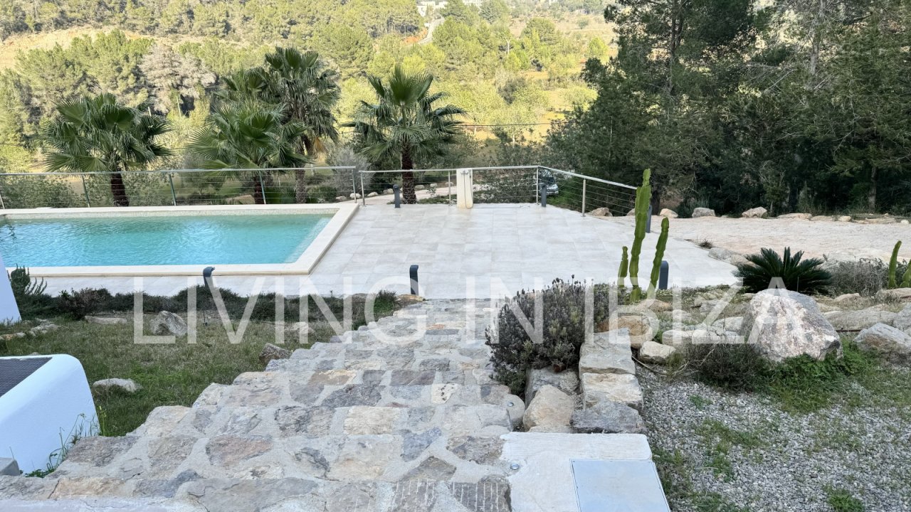 Jährliche/unmöblierte Vermietung. Moderne Villa mit Schwimmbad in der Gegend von San Juan de Labritja, im Norden der Insel Ibiza, am Hang eines Hügels. Es ist ein sehr komfortables und praktisches Haus mit hellen Räumen und großen Fenstern, die einen herrlichen Blick in die Natur bieten.