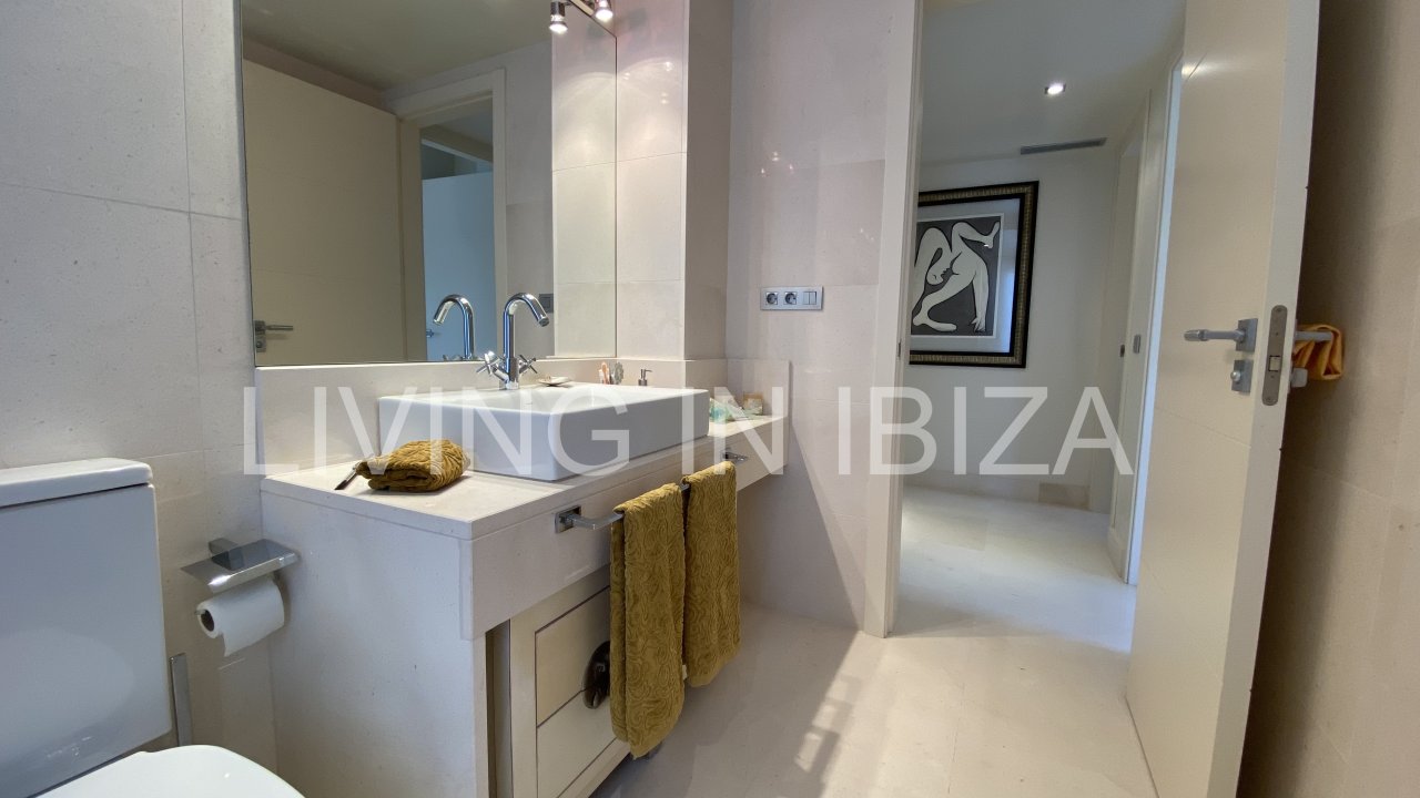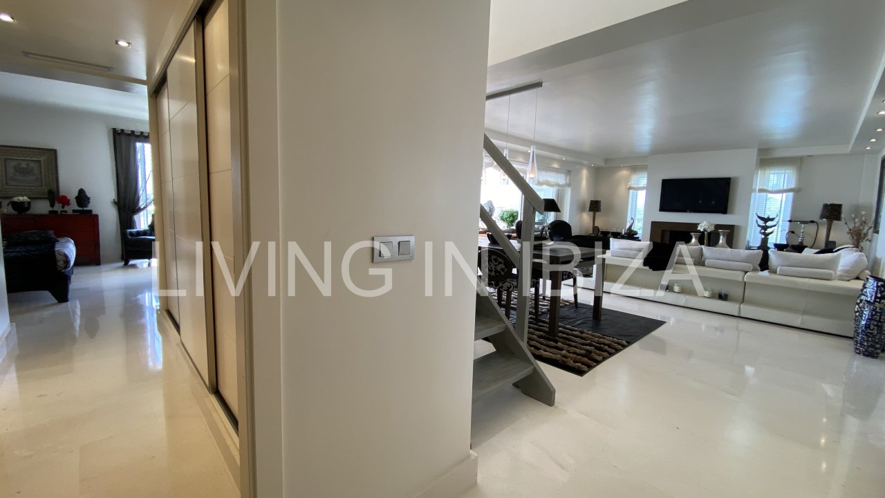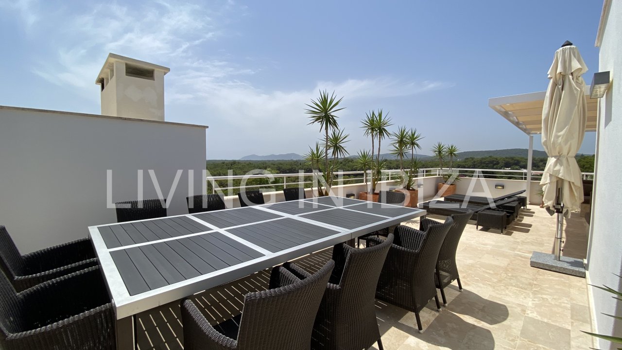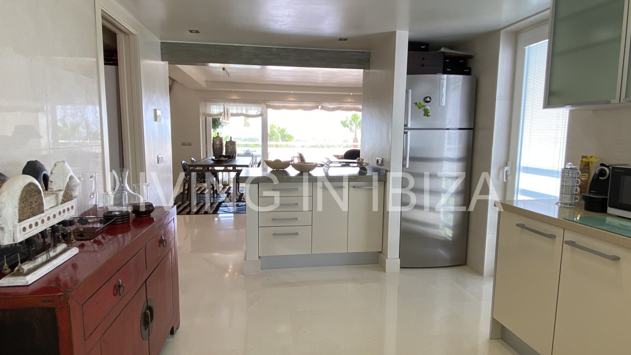 Designer Penthaus, erste Meereslinie, Sonnenterrase mit Whirlpool, privatem Strandzugang, Pool, Paddle Court, Doppelgarage auf Ibiza zum Kauf