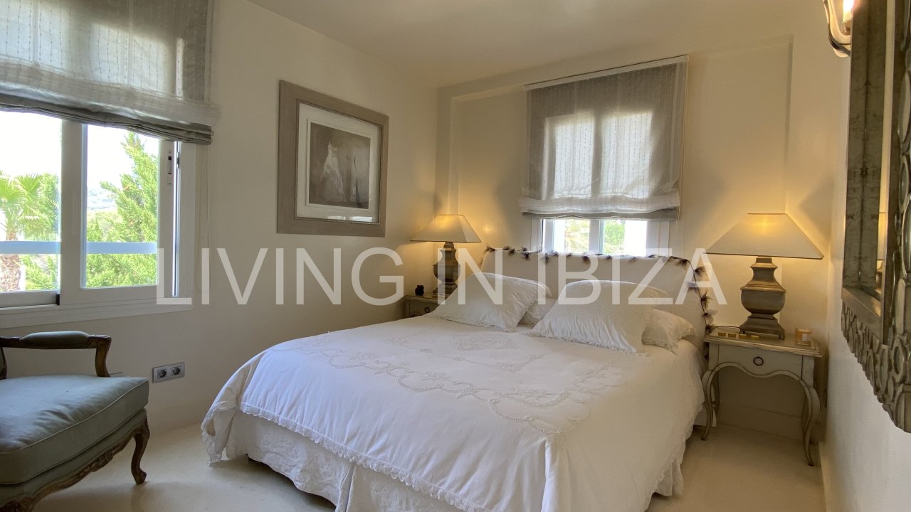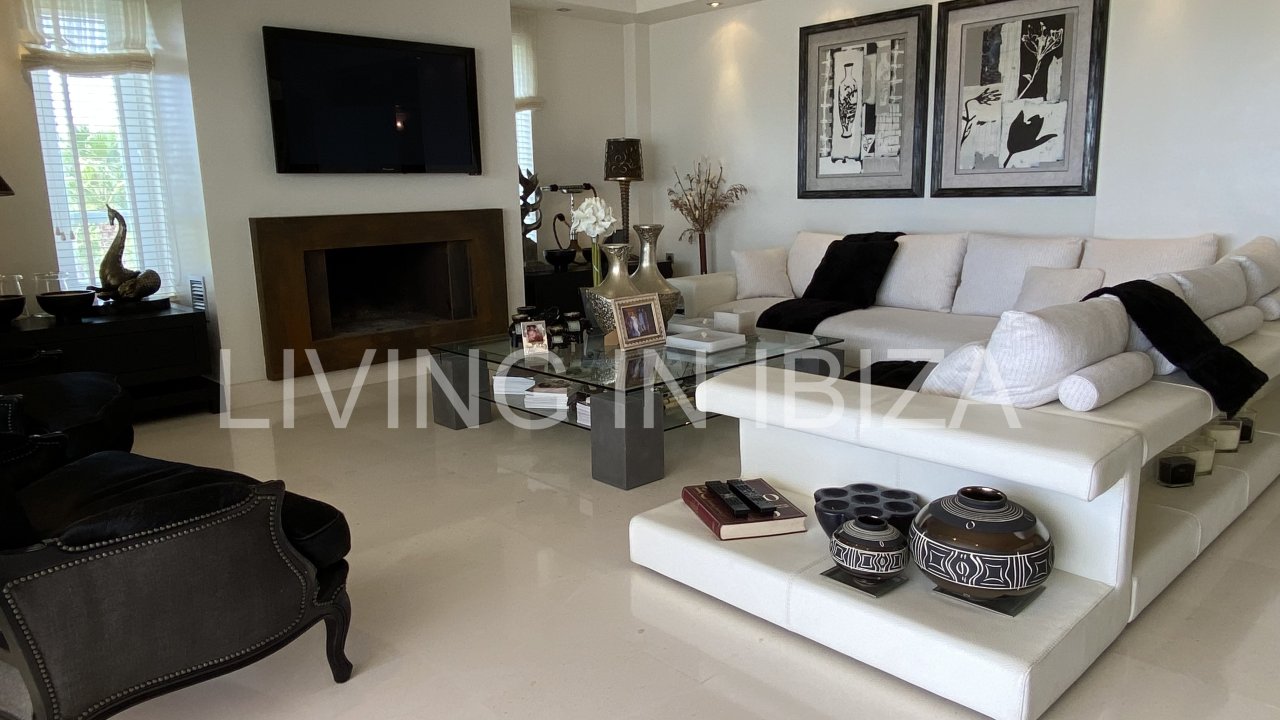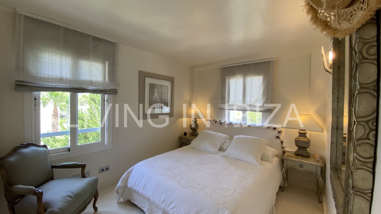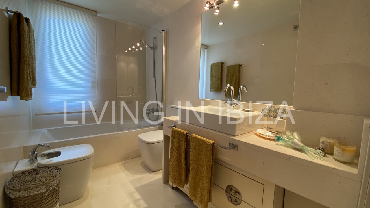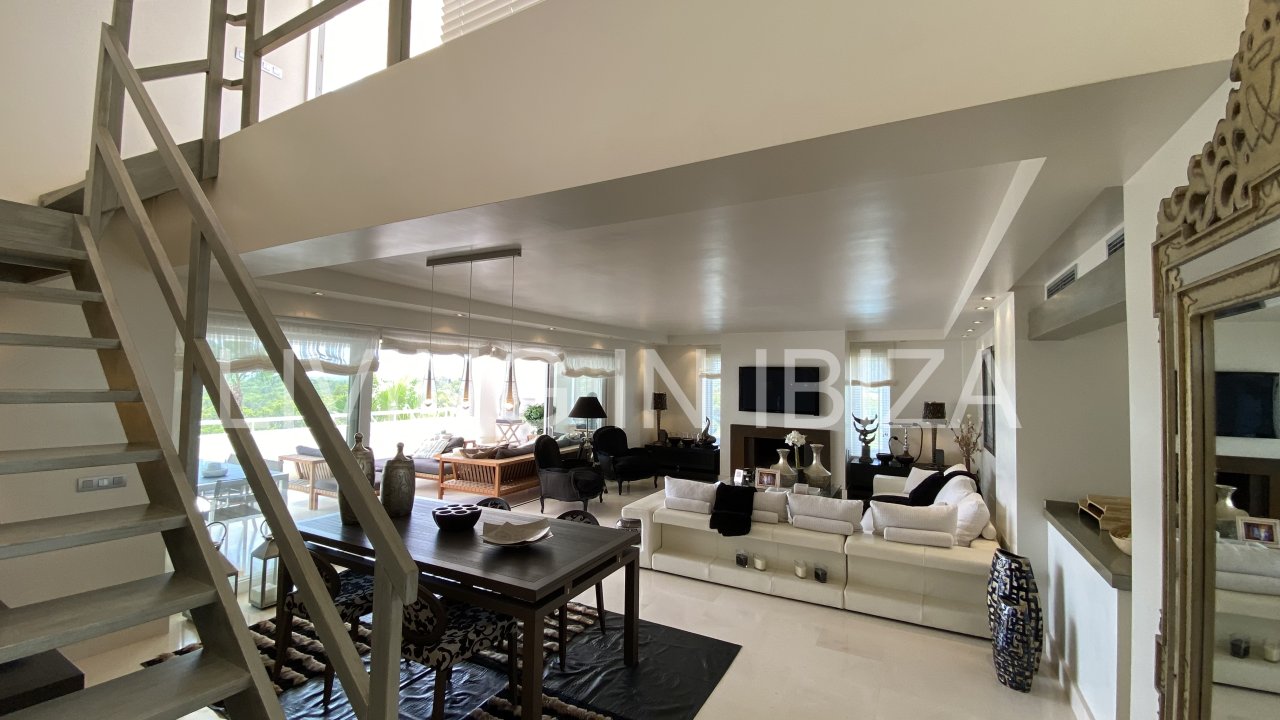 Designer Penthaus, erste Meereslinie, Sonnenterrase mit Whirlpool, privatem Strandzugang, Pool, Paddle Court, Doppelgarage auf Ibiza zum Kauf