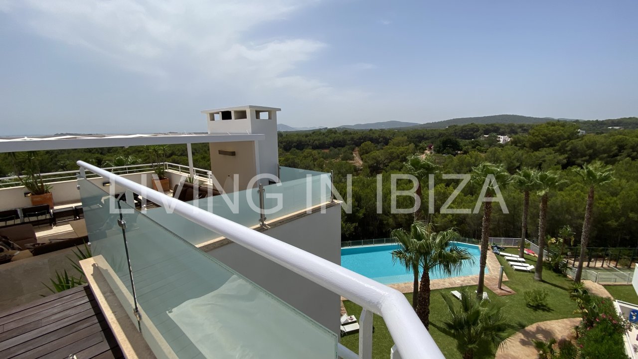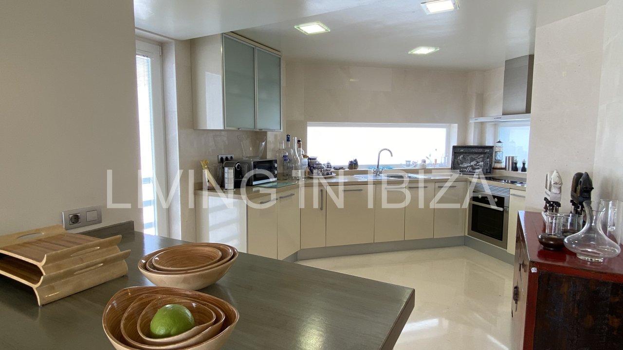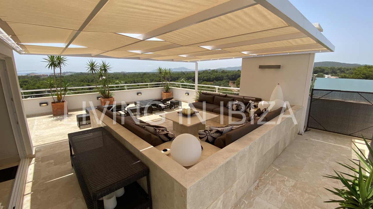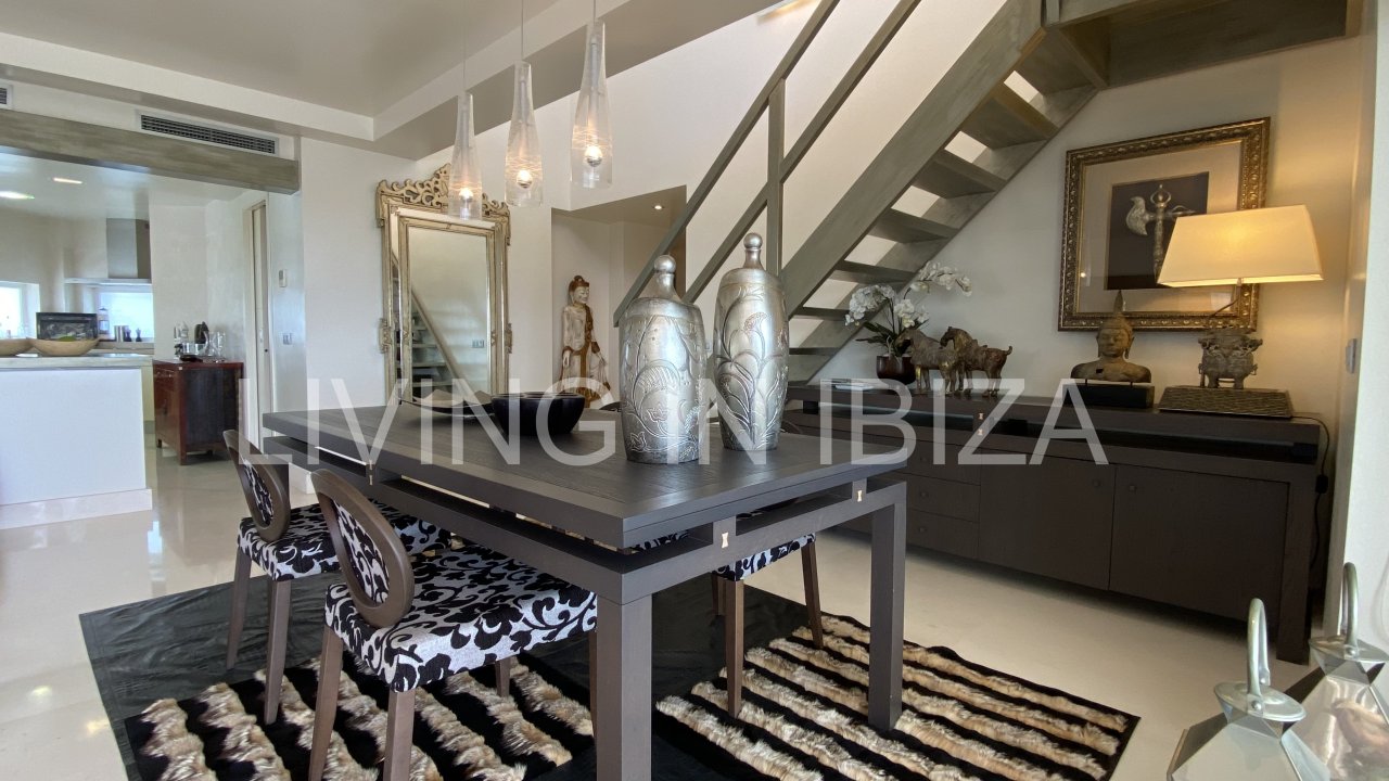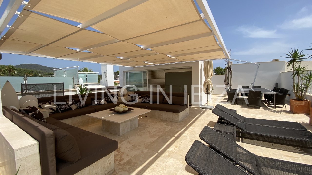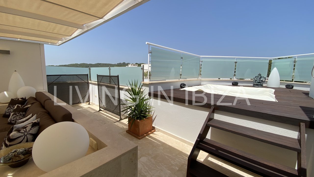 Designer Penthaus Apartment in erster Meereslinie, mit privatem Strandzugang, 2 Gemeinschafts-Schwimmbäder und 2 Paddel-Tennis Plätze in San Carlos, im Nordosten von Ibiza zu verkaufen.