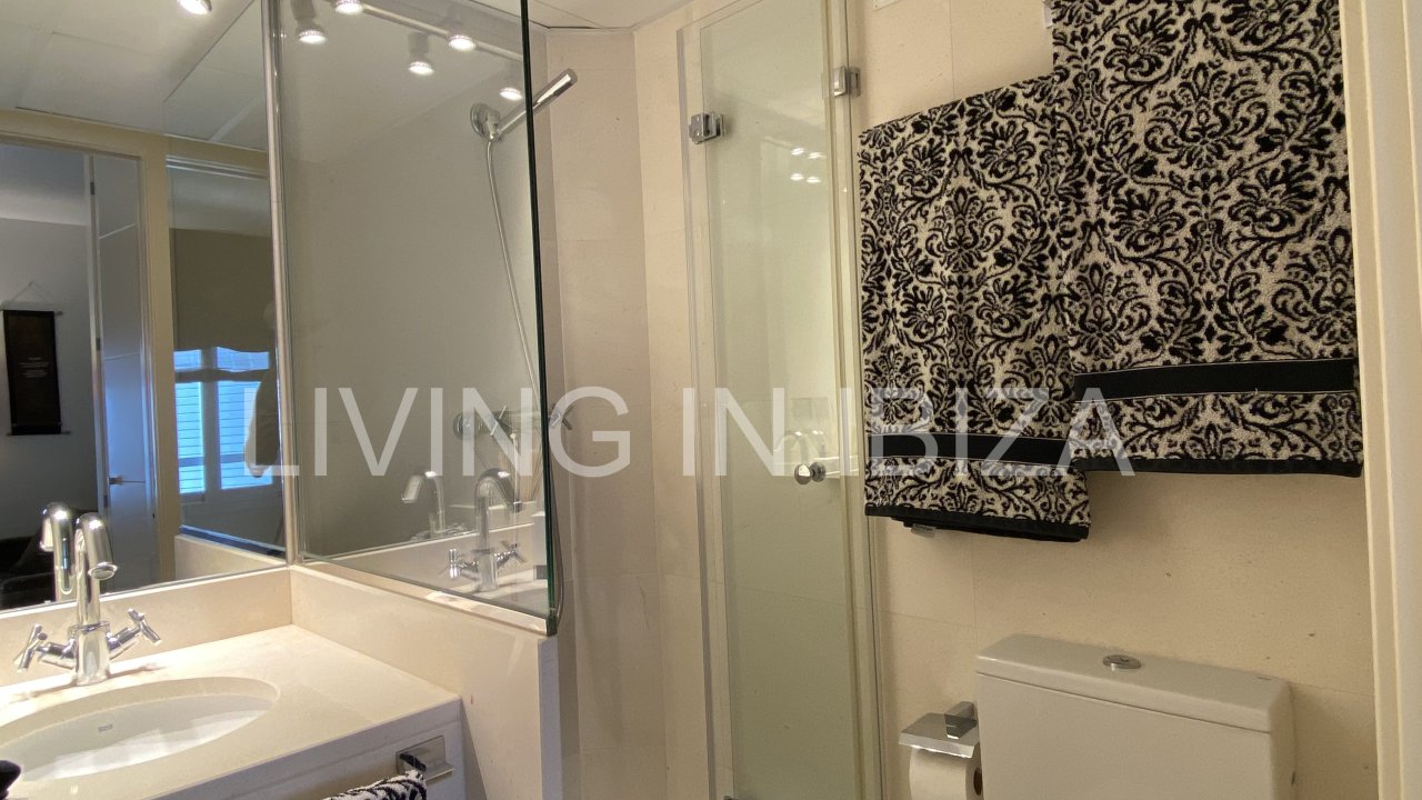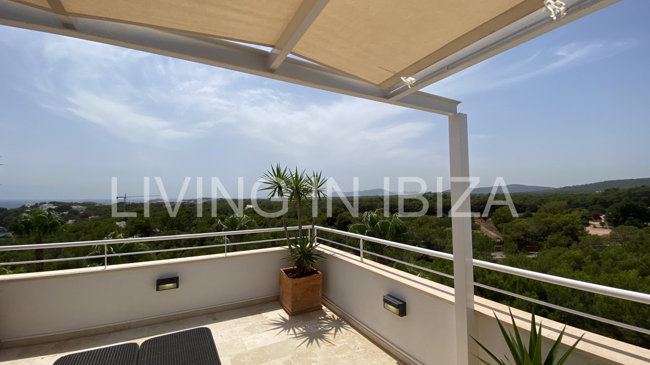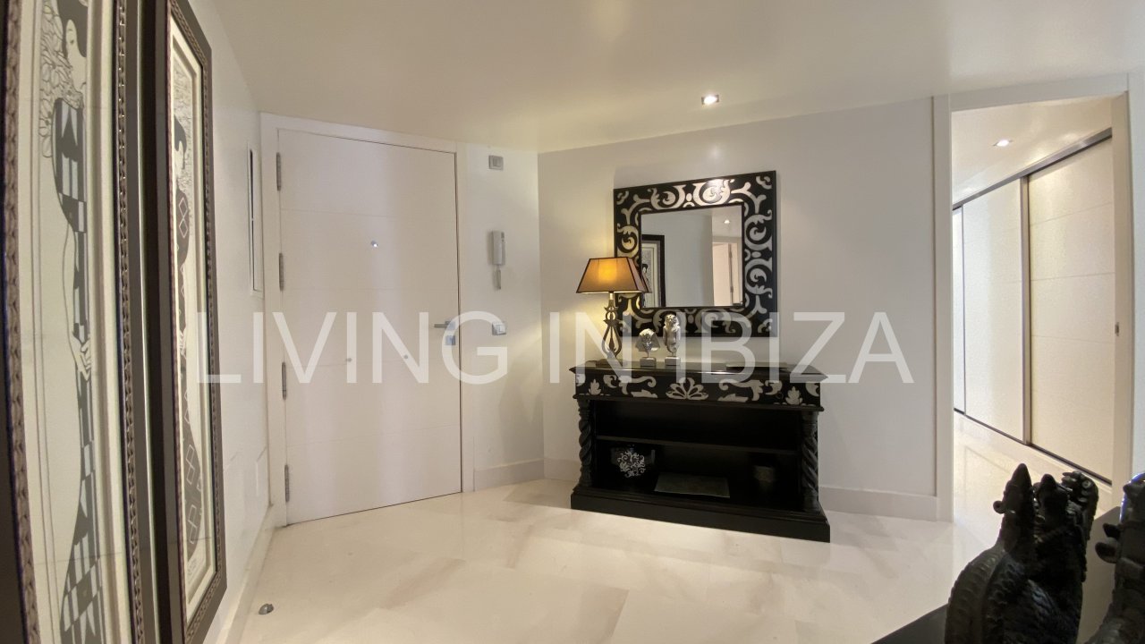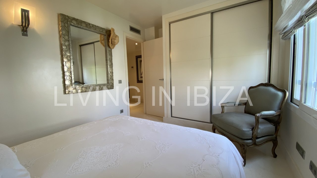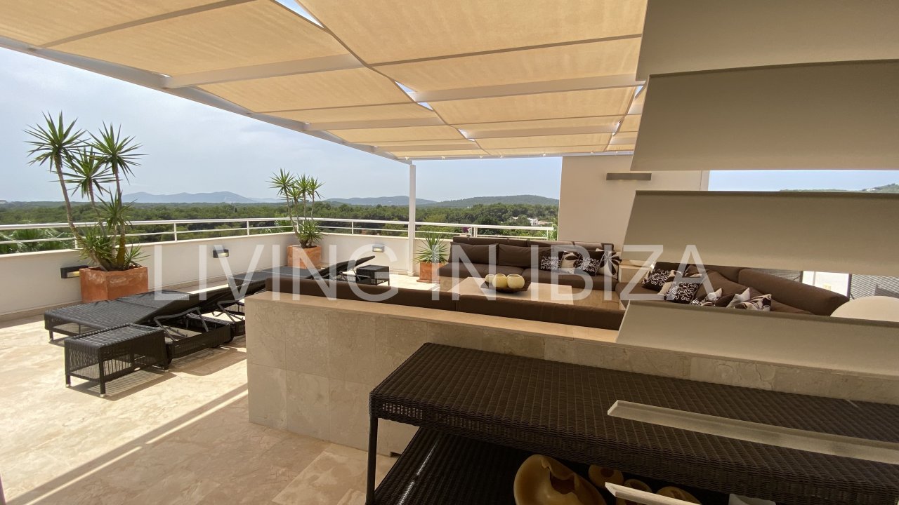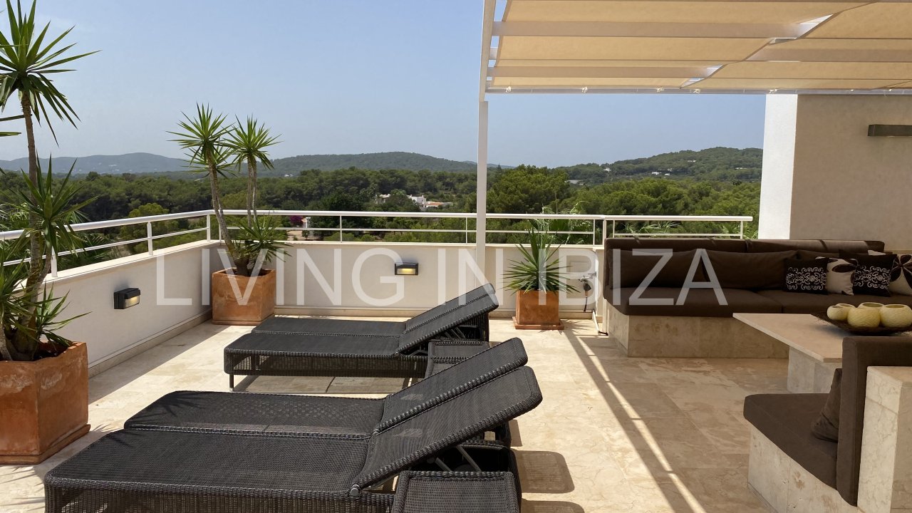 Designer Penthaus Apartment in erster Meereslinie, mit privatem Strandzugang, 2 Gemeinschafts-Schwimmbäder und 2 Paddel-Tennis Plätze in San Carlos, im Nordosten von Ibiza zu verkaufen.