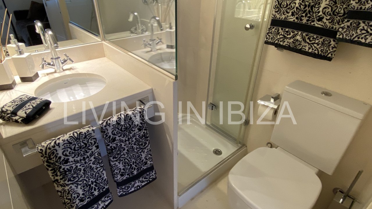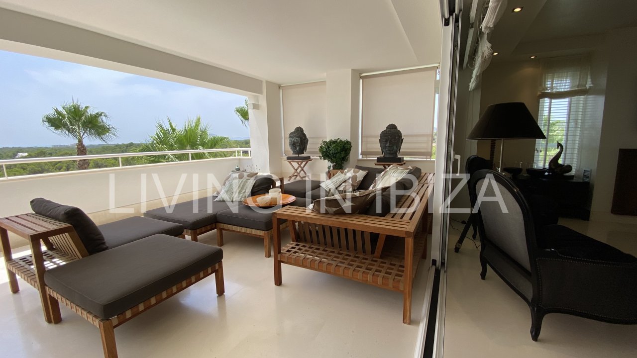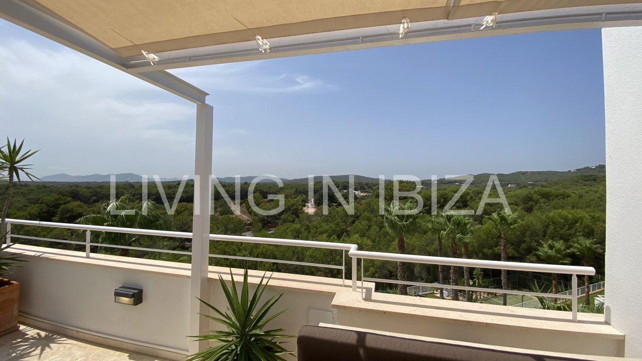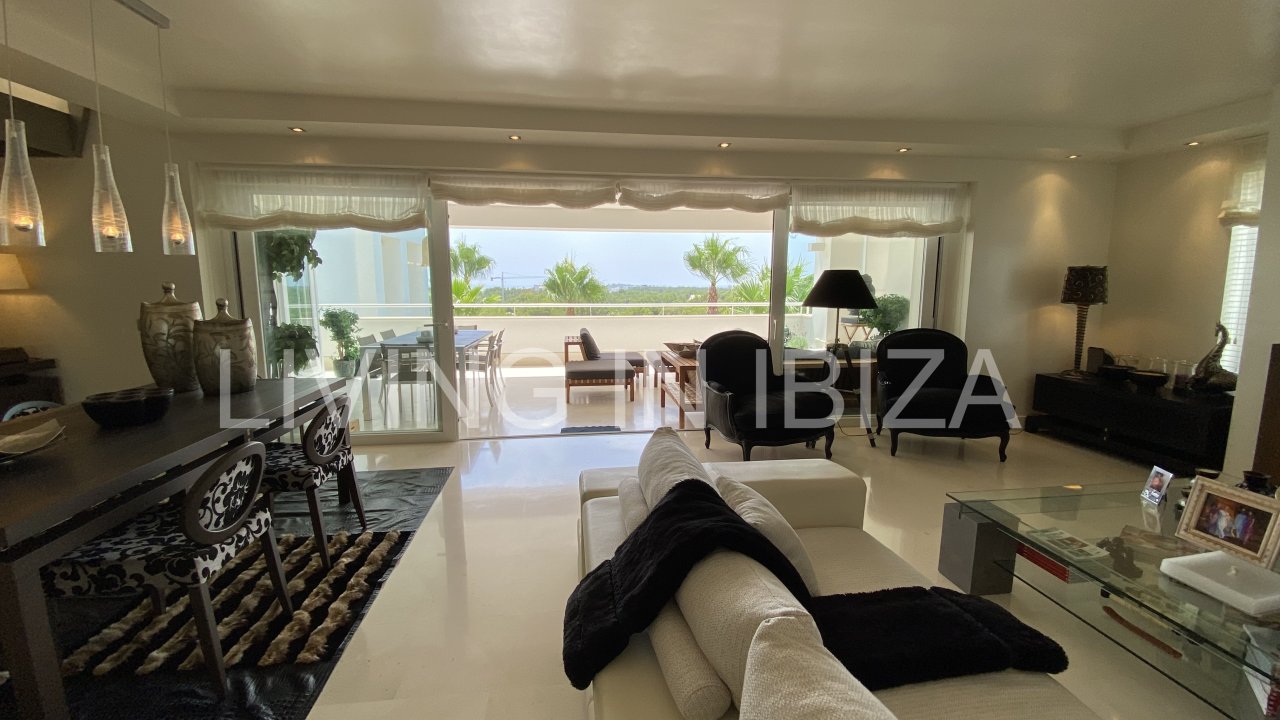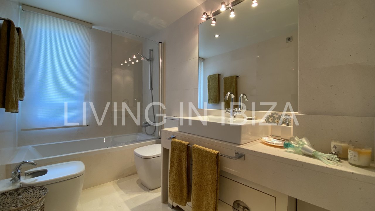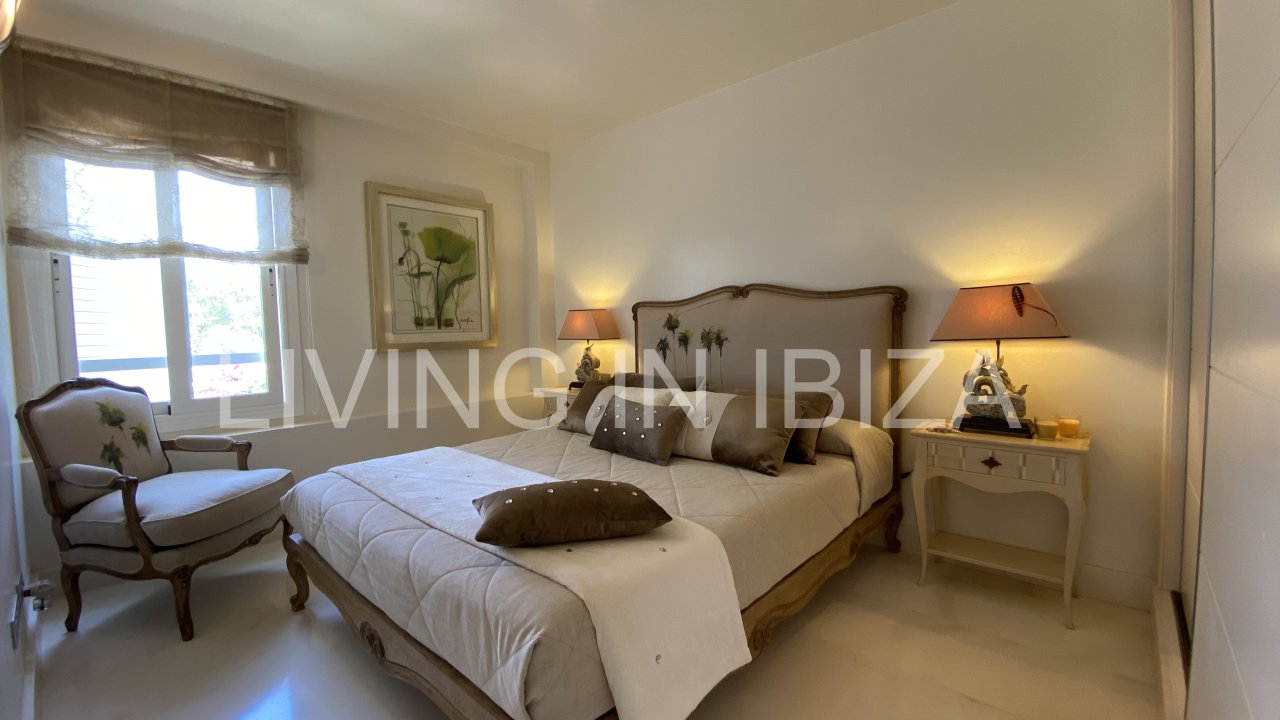 Designer Penthaus Apartment in erster Meereslinie, mit privatem Strandzugang, 2 Gemeinschafts-Schwimmbäder und 2 Paddel-Tennis Plätze in San Carlos, im Nordosten von Ibiza zu verkaufen.