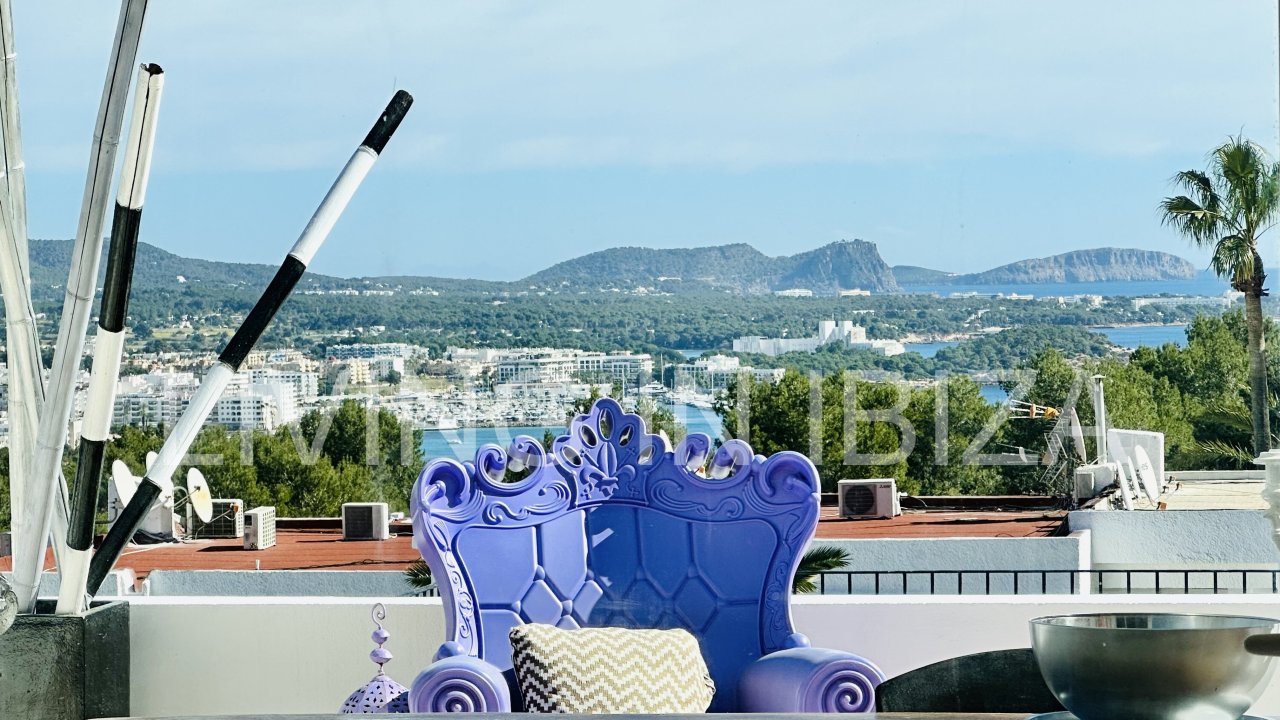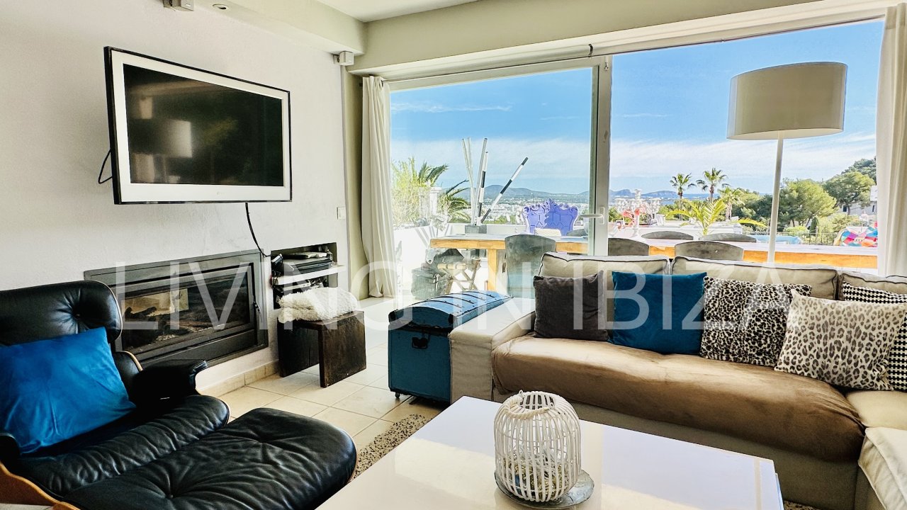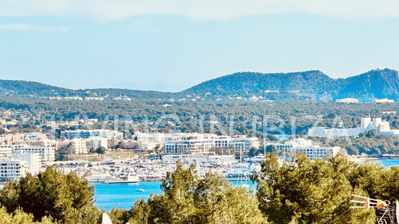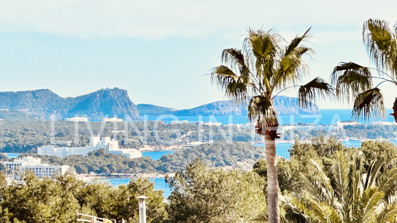 Santa Eulalia Bay: Saisonale Vermietung. Diese schöne und gemütliche Wohnung befindet sich in den Bergen von Siesta, in einer ruhigen Gegend von Santa Eulalia del Río, nur wenige Autominuten von den Stränden von Siesta, Santa Eulalia und Cala Llonga entfernt. Mit gemeinschaftlichen Gartenbereichen, Bäumen und Gemeinschaftspools. Freier Blick auf die Bucht von Santa Eulalia del Río.