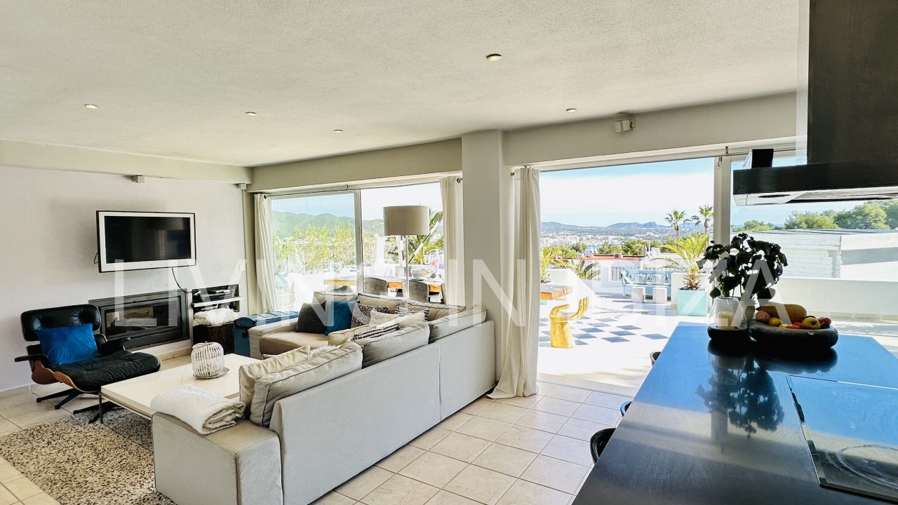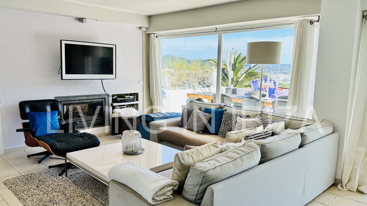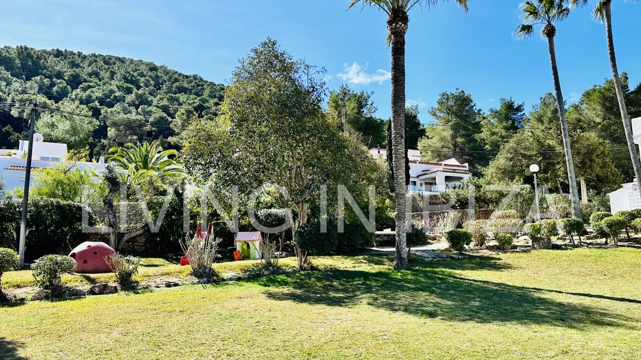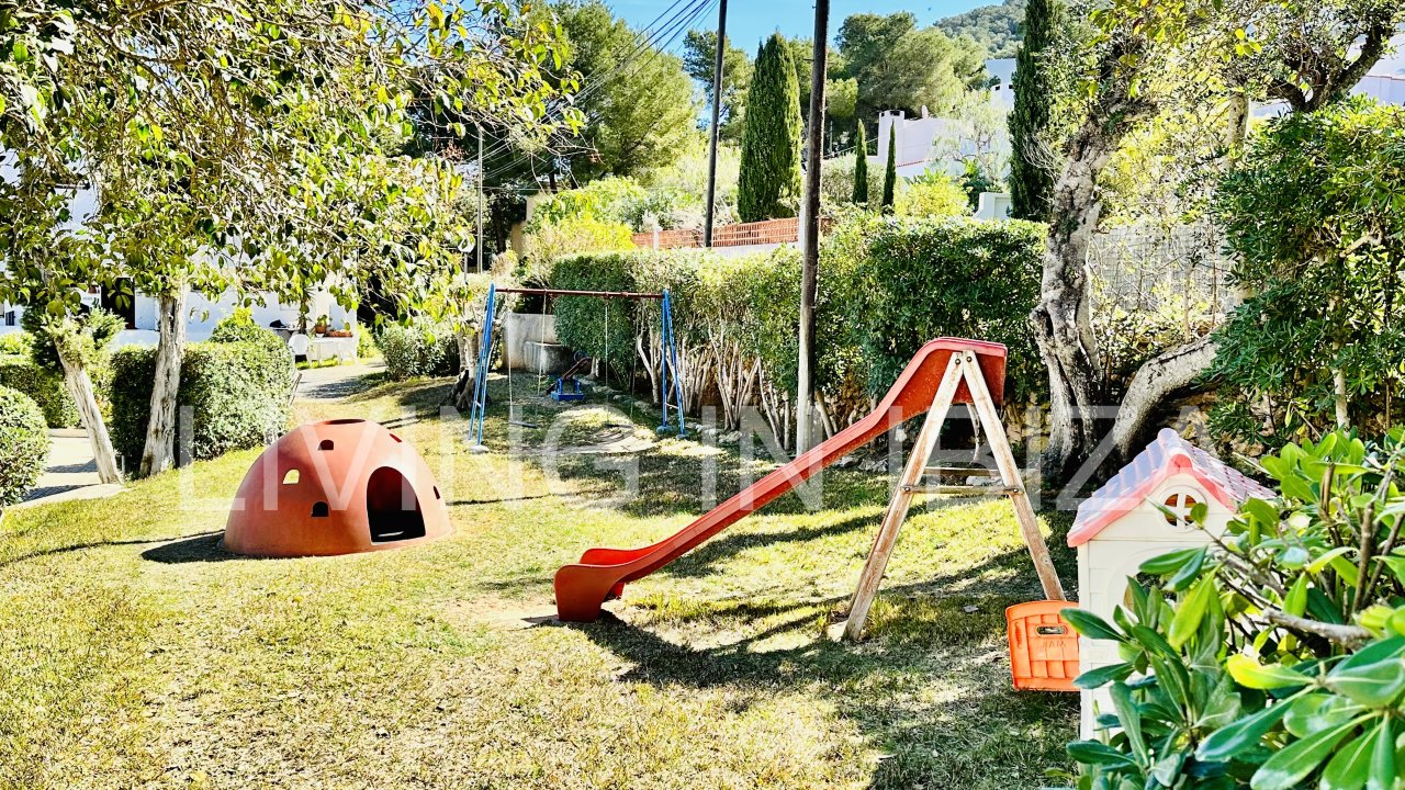 Santa Eulalia Bay: Saisonale Vermietung. Diese schöne und gemütliche Wohnung befindet sich in den Bergen von Siesta, in einer ruhigen Gegend von Santa Eulalia del Río, nur wenige Autominuten von den Stränden von Siesta, Santa Eulalia und Cala Llonga entfernt. Mit gemeinschaftlichen Gartenbereichen, Bäumen und Gemeinschaftspools. Freier Blick auf die Bucht von Santa Eulalia del Río.