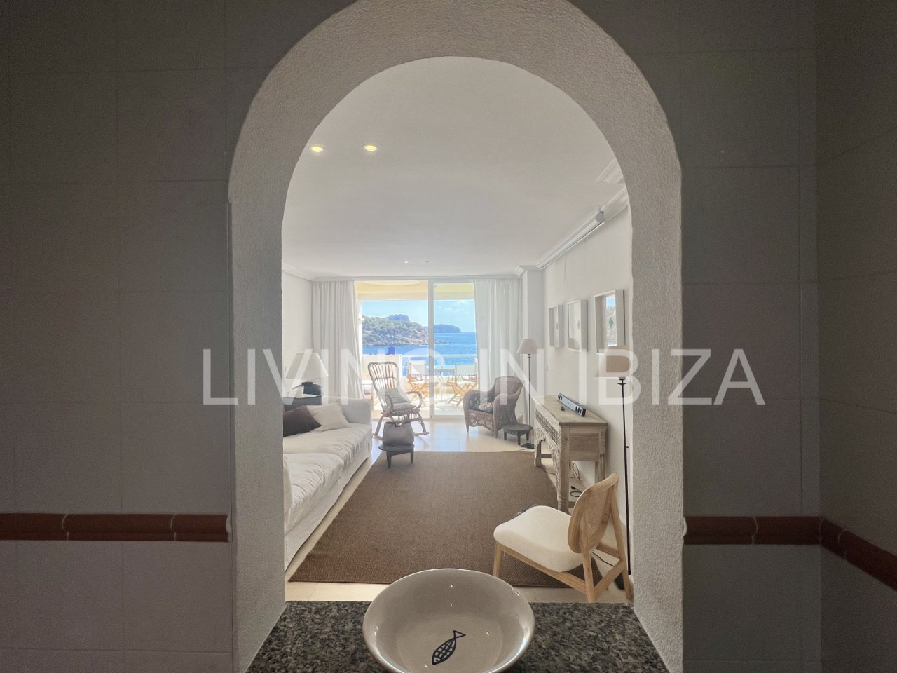 Wohnung zur verkaufen, mit Blick auf die Bucht von Cala Llenya, auf der Insel Ibiza. Modern möbliertes