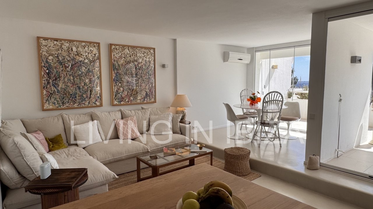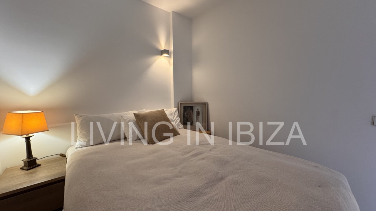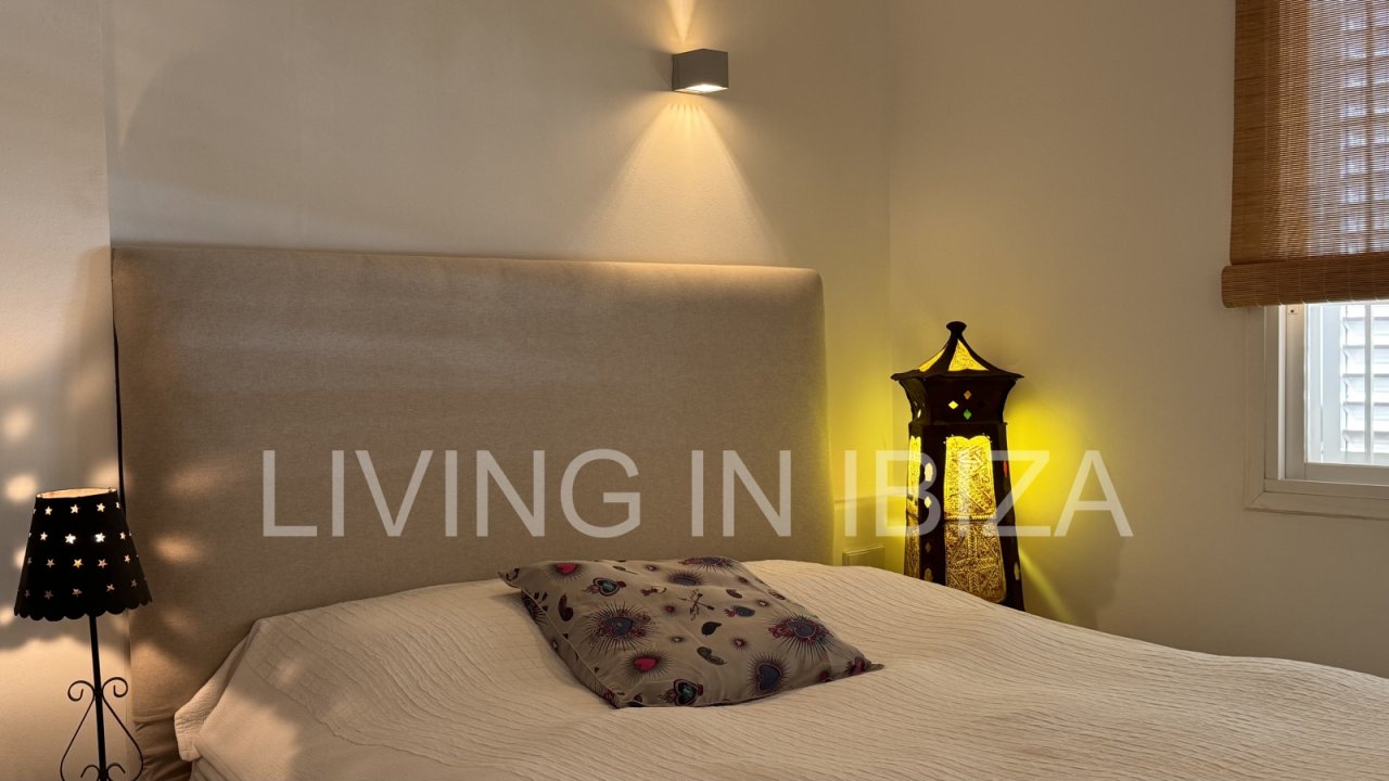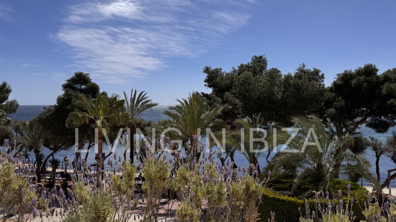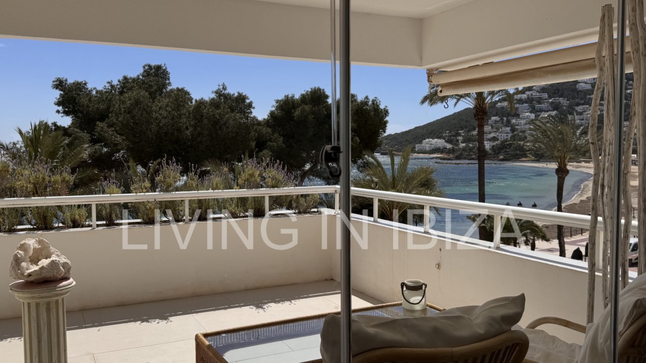 Attractive designer apartment on the frontline of the sea and beach, located on the seafront promenade of Santa Eulalia del Río, with stunning sea views and a parking space in Ibiza. Available from 1st October 2025.