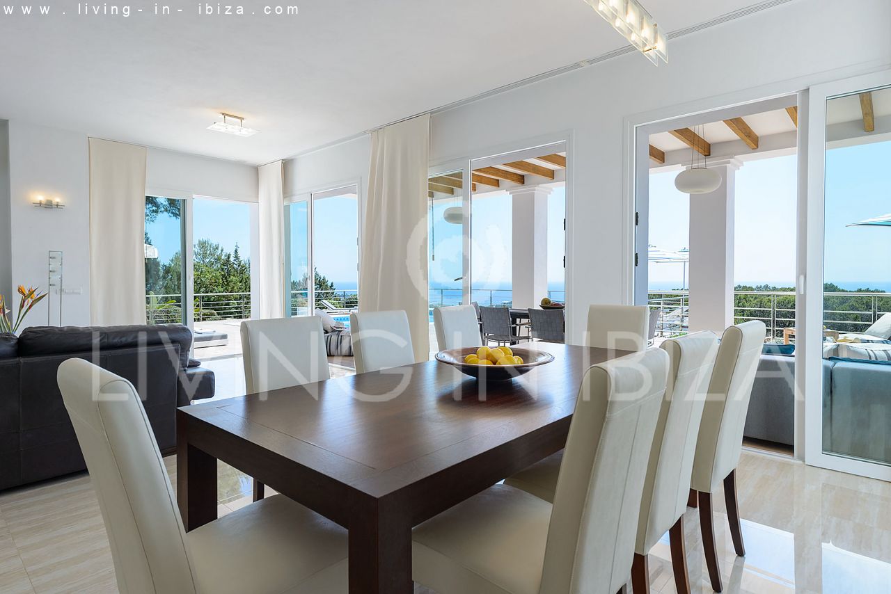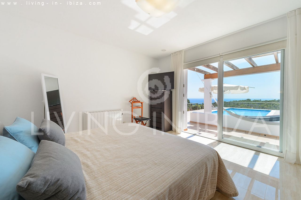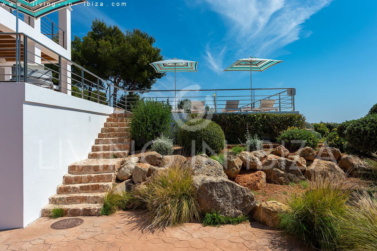 Rented all year round / Long term contract. Villa Maiami, near San Carlos, Santa Eulalia, in Ibiza. Mediterranean, modern style with stunning views towards the sea and green areas. Pool, several terraces, barbecue, covered terrace. Double glazing, aluminum openings. Guest apartment Garage. South orientation. Central heating. Air conditioning hot / cold.
