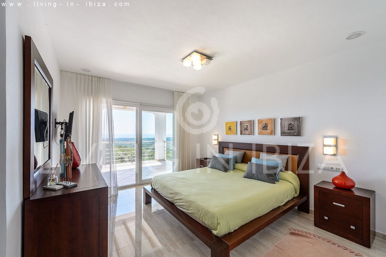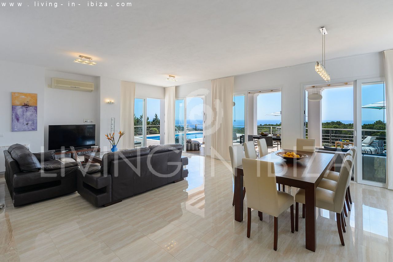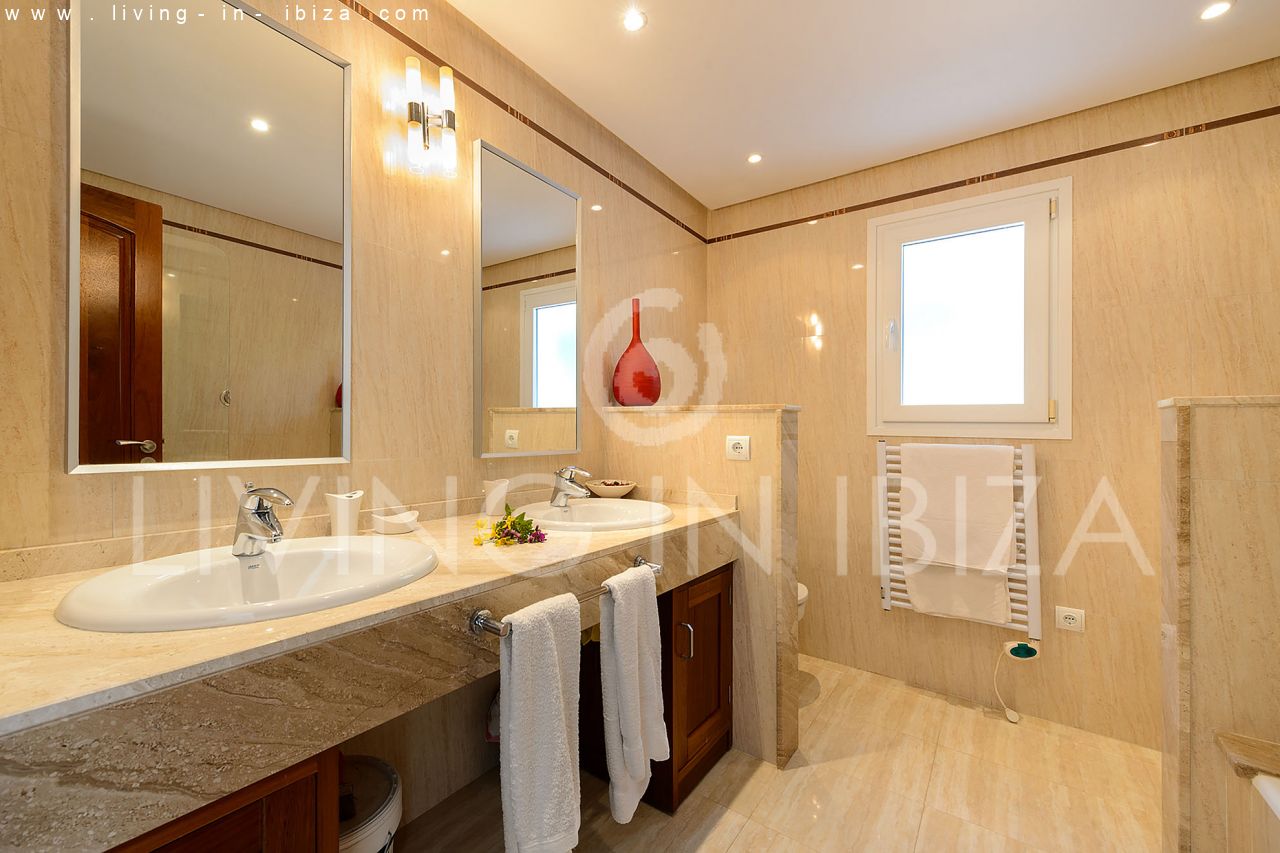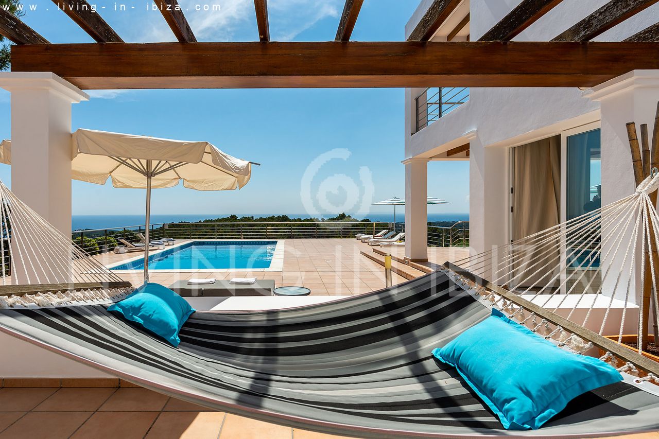 Rented all year round / Long term contract. Villa Maiami, near San Carlos, Santa Eulalia, in Ibiza. Mediterranean, modern style with stunning views towards the sea and green areas. Pool, several terraces, barbecue, covered terrace. Double glazing, aluminum openings. Guest apartment Garage. South orientation. Central heating. Air conditioning hot / cold.
