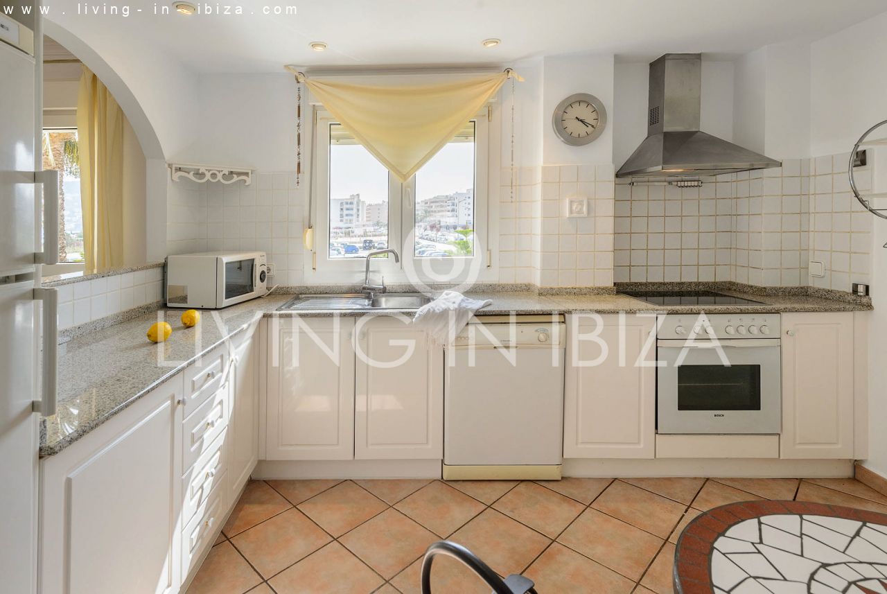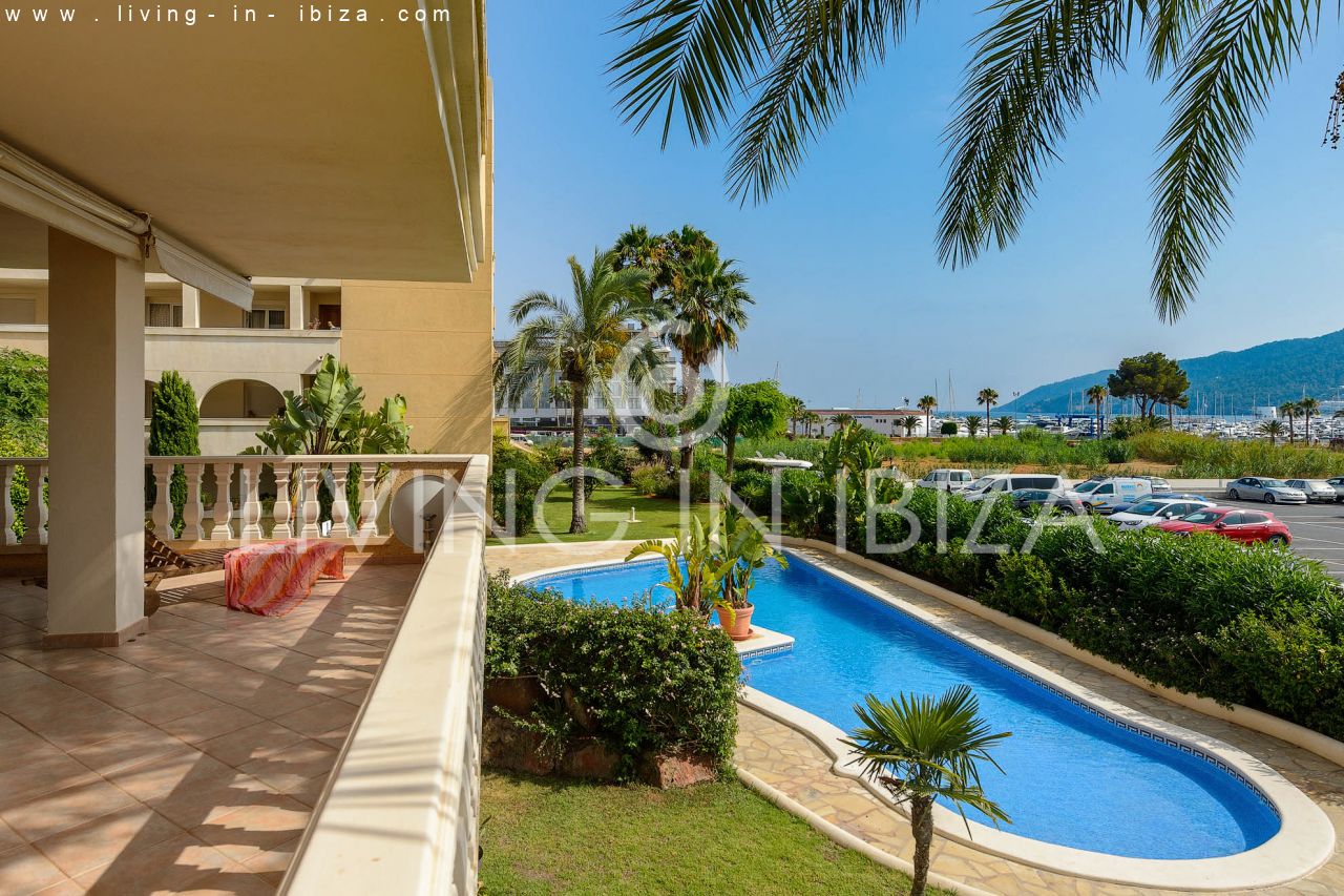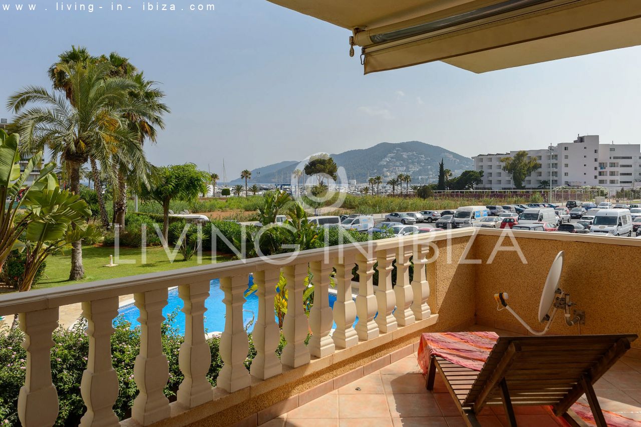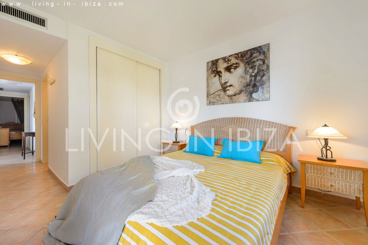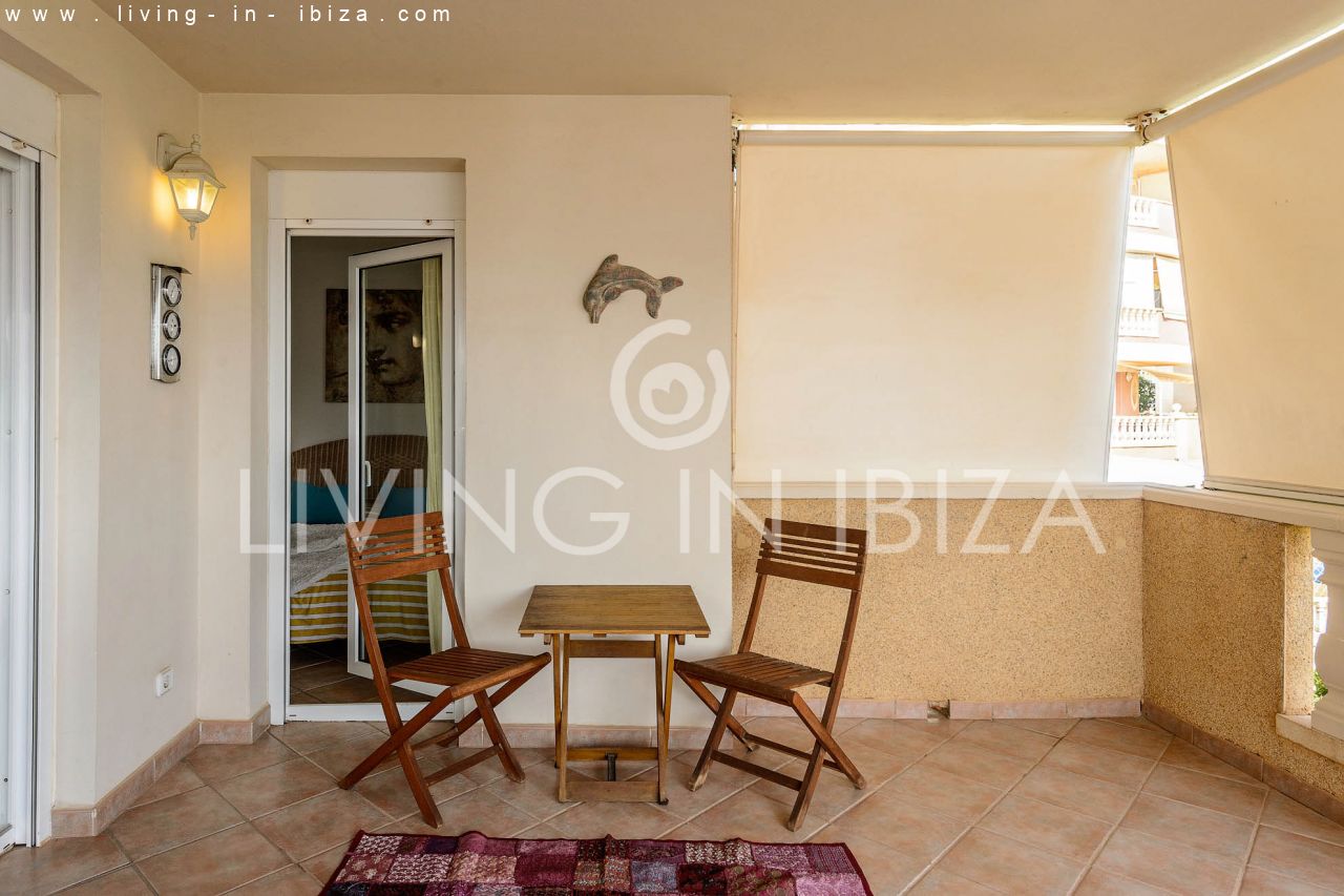 The breadth, comfort and high quality are the main characteristics of this house. Distribution: three double bedrooms and two bathrooms (one of the bathrooms is en suite) Individual kitchen and large living room. Balcony with enough space for table and chairs. Views from the balcony to the pool, the community garden and the port of Santa Eulalia.