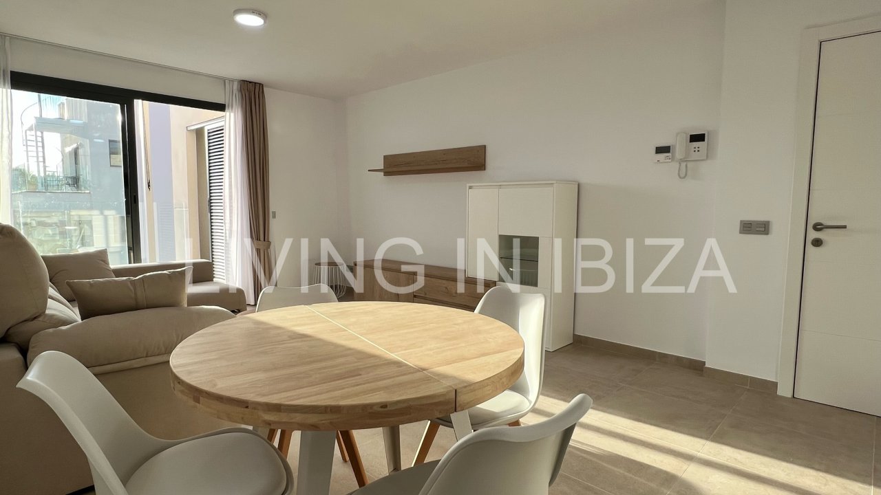 Penthouse Bahía available for long-term rental. This attractive, modern penthouse is in pristine condition and is located in a recently built luxury development in the town of Santa Eulalia del Río. It boasts a fantastic private roof terrace with sea views, access to a communal swimming pool, and a parking space and storage room in the basement of the same building.