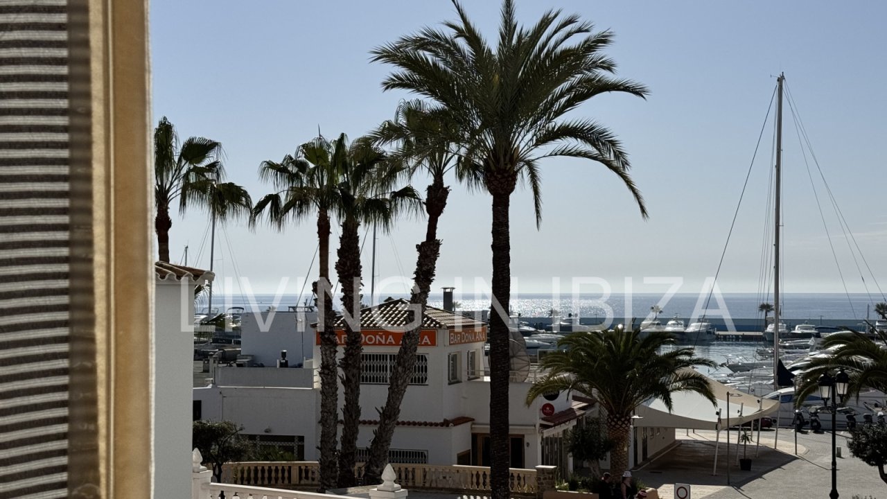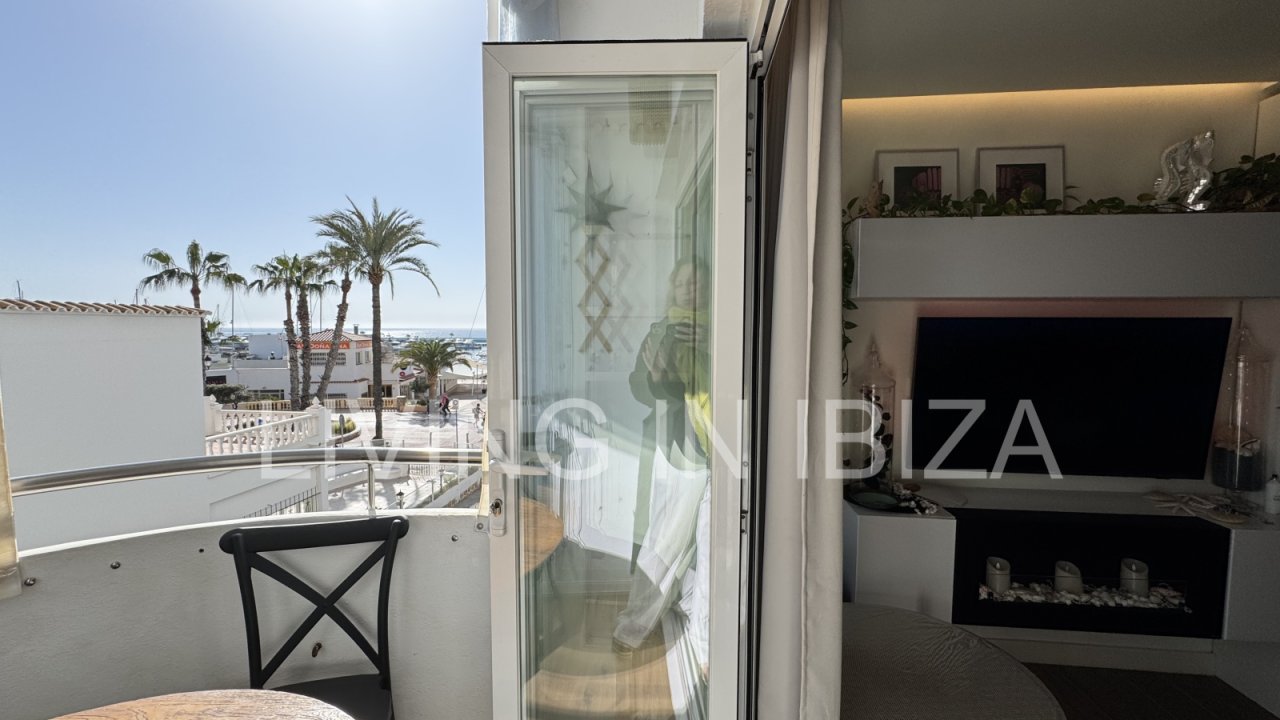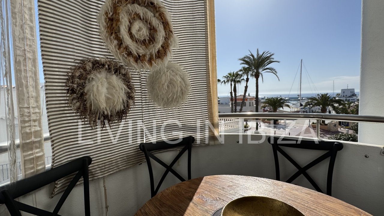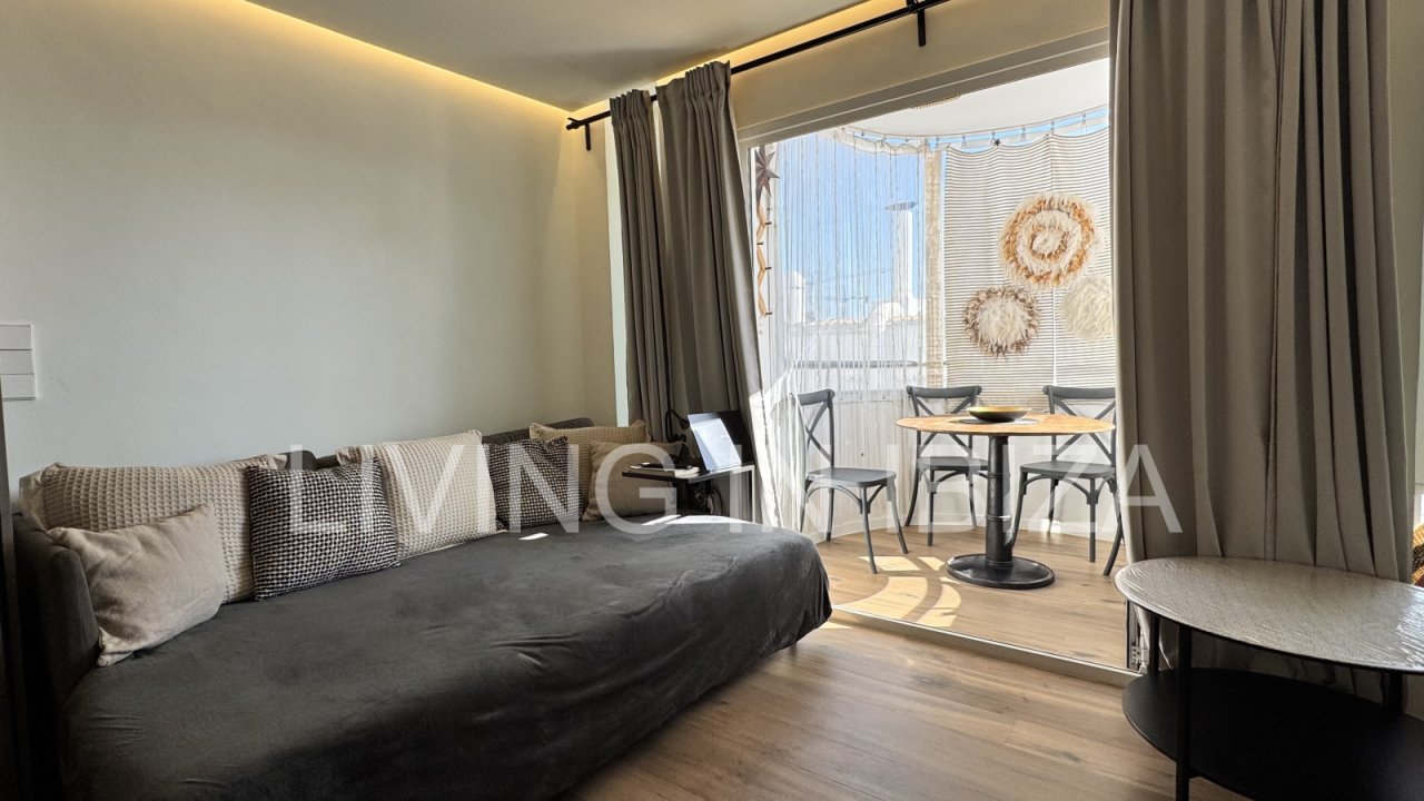Seasonal temporary rental, cozy studio apartment with sea views on first line on promenade of Santa Eulalia del Rio, Ibiza.