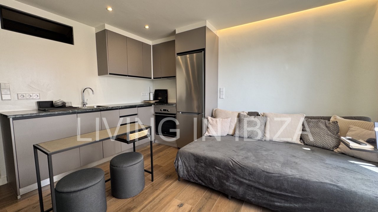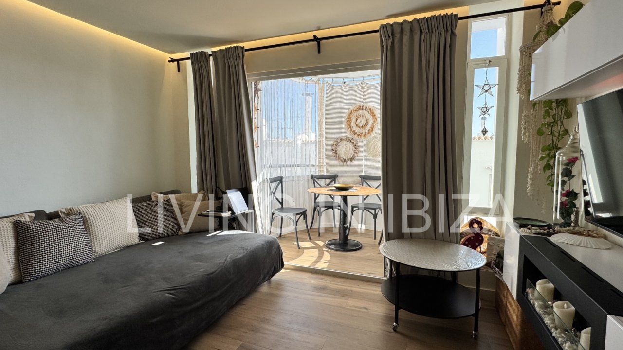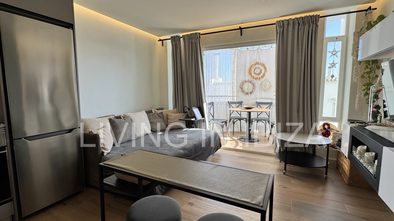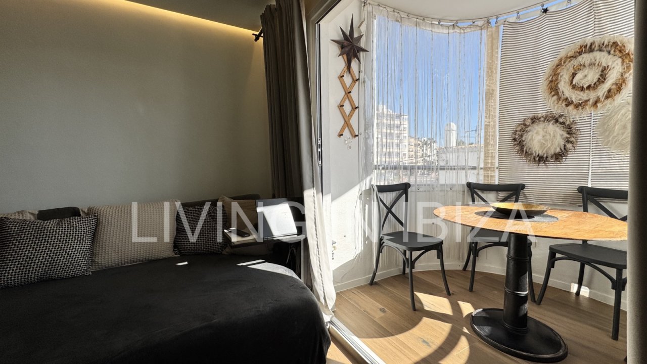 Temporary seasonal contract 6 to 8 months, studio apartment on the Paseo Marítimo in Santa Eulalia, Ibiza, with fantastic views of the sea, Formentera and the marina. Totally renovated and very light. The house is located a few metres from the beach, in the centre of the town, where you will find everything you need: supermarkets, shops, pharmacies, post office, hairdressers, etc.