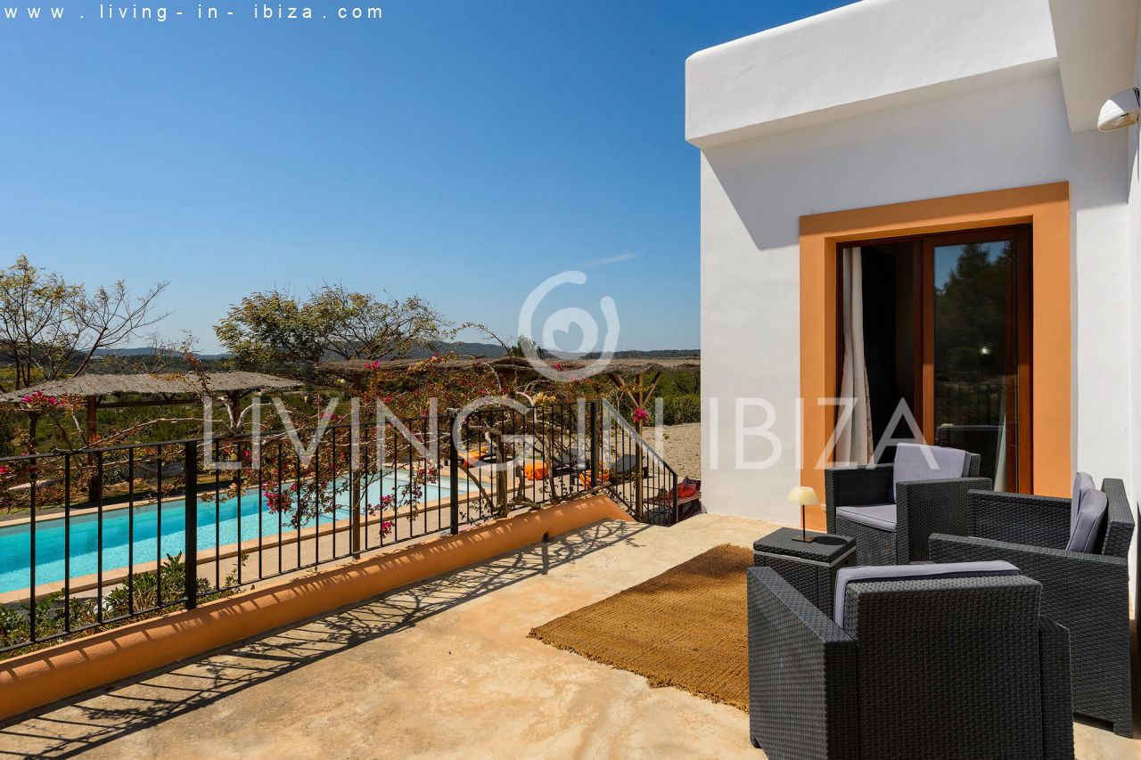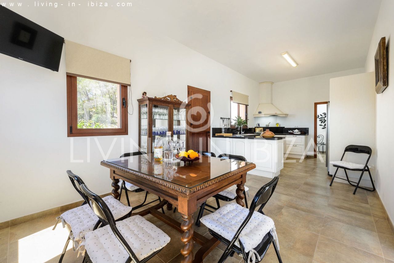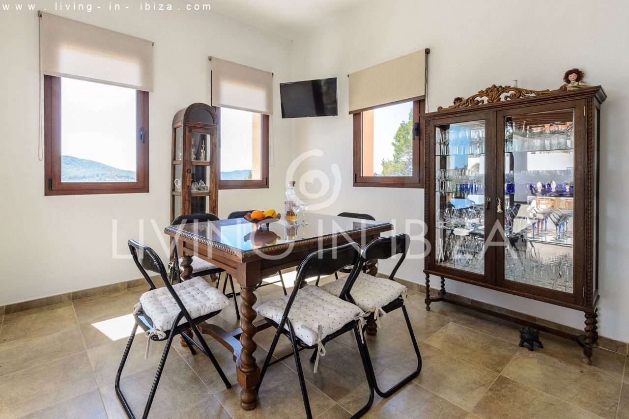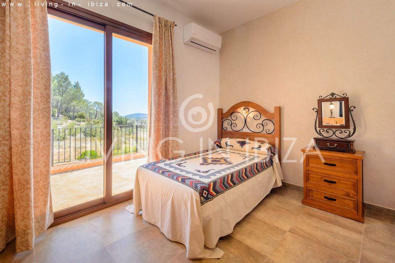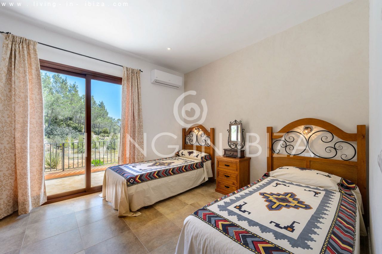 Alquiler anual / Contrato a largo plazo. Fantástico chalet en el campo con piscina, en San Carlos, Santa Eulalia del Río, Ibiza. Ubicado junto a un frondoso bosque, con magníficas vistas a valles. La casa está dividida en una vivienda principal con 3 dormitorios y 3 baños + un anexo con 2 dormitorios y un baño. Cada vivienda con su propia cocina. La propiedad de dos plantas, inmersa en la naturaleza, es el sitio ideal para una familia o una pareja que disfruta de la visita de familiares y amigos. Calefacción central y por suelo radiante. Aire acondicionado frío / calor. Salón con chimenea.