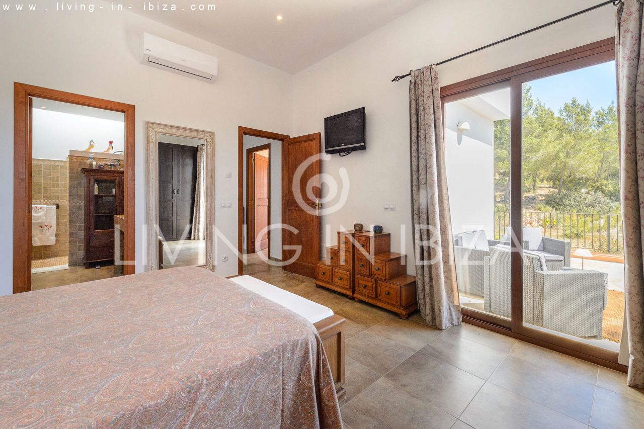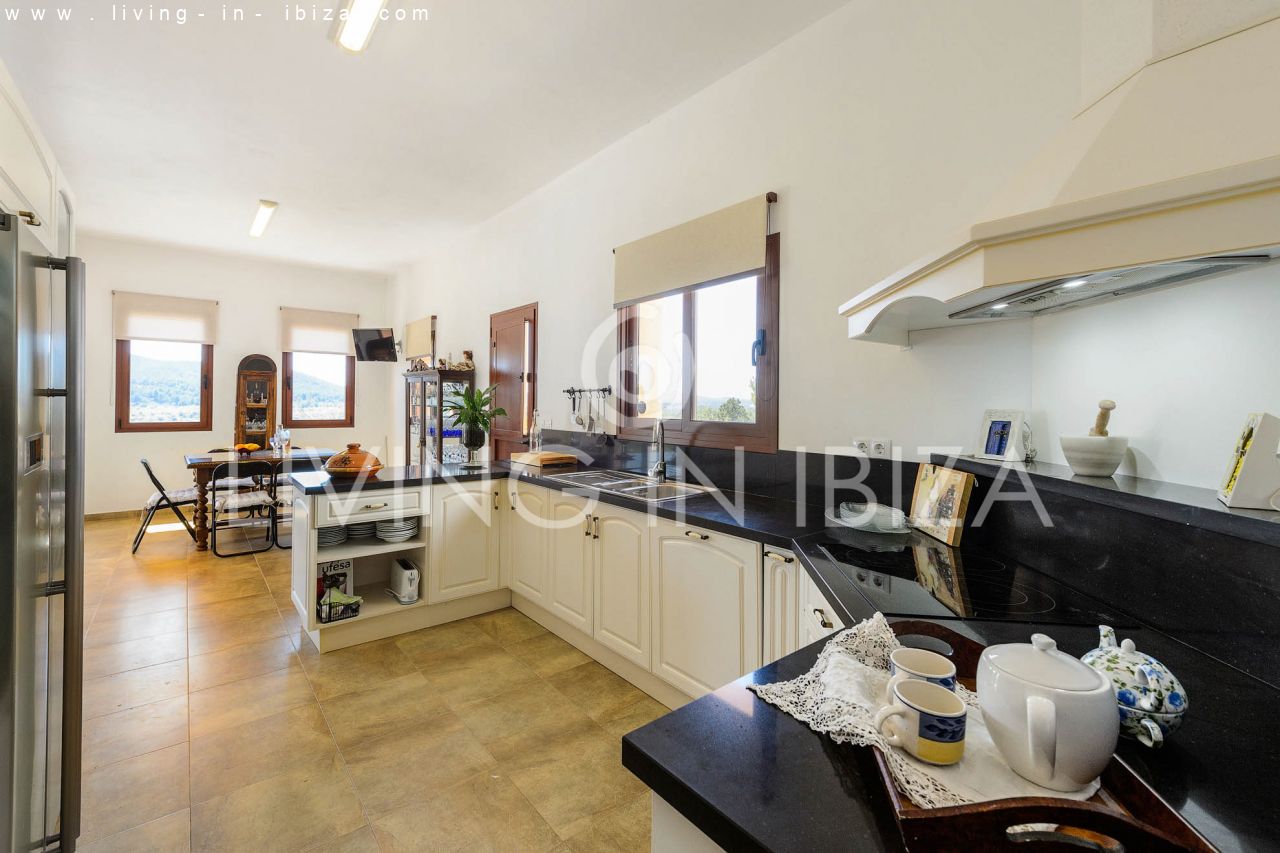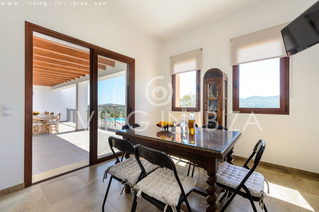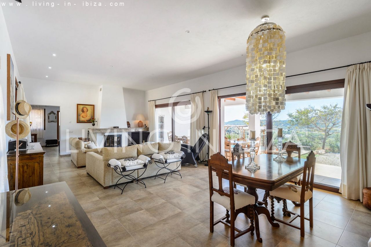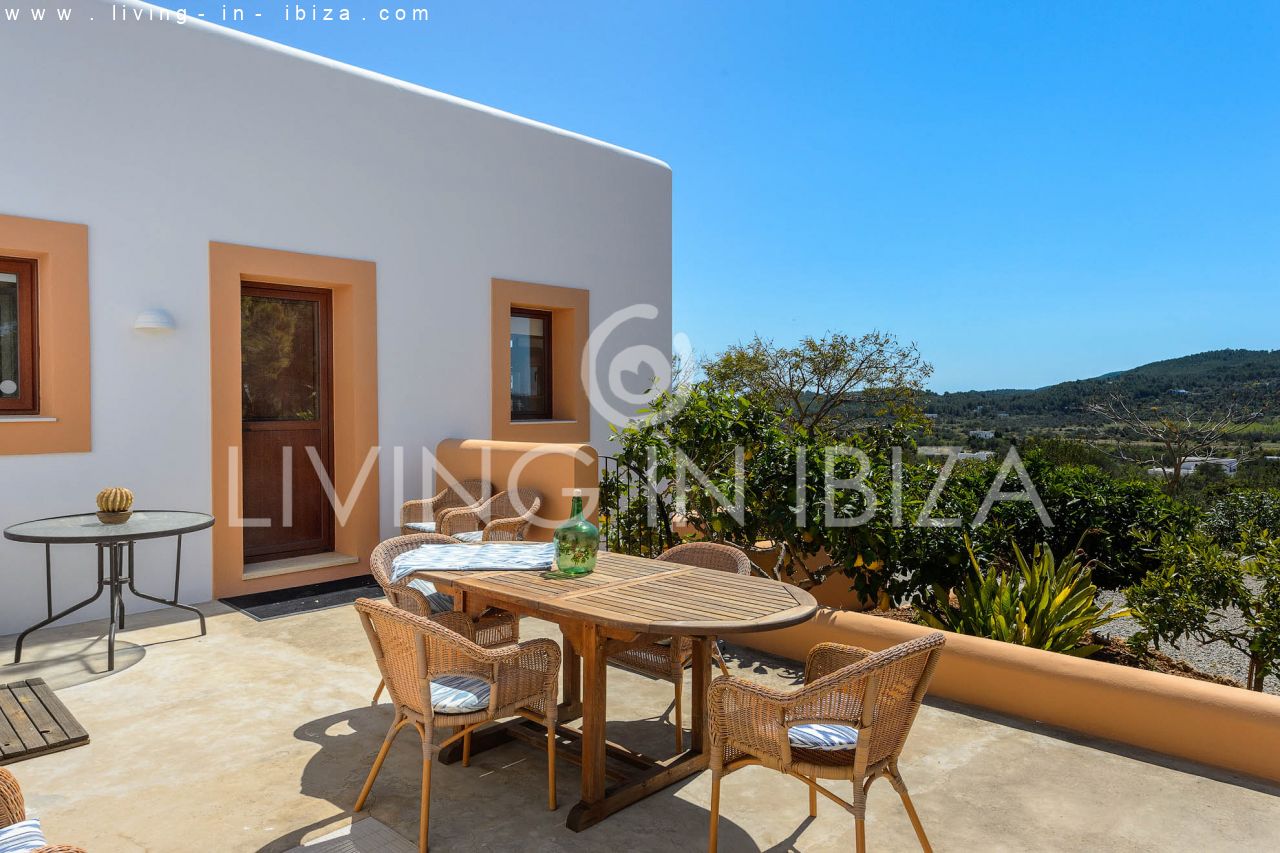 Alquiler anual / Contrato a largo plazo. Fantástico chalet en el campo con piscina, en San Carlos, Santa Eulalia del Río, Ibiza. Ubicado junto a un frondoso bosque, con magníficas vistas a valles. La casa está dividida en una vivienda principal con 3 dormitorios y 3 baños + un anexo con 2 dormitorios y un baño. Cada vivienda con su propia cocina. La propiedad de dos plantas, inmersa en la naturaleza, es el sitio ideal para una familia o una pareja que disfruta de la visita de familiares y amigos. Calefacción central y por suelo radiante. Aire acondicionado frío / calor. Salón con chimenea.
