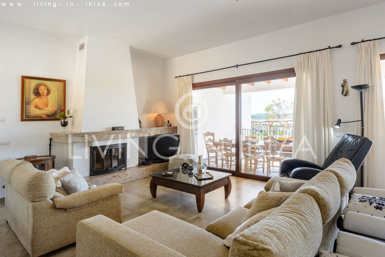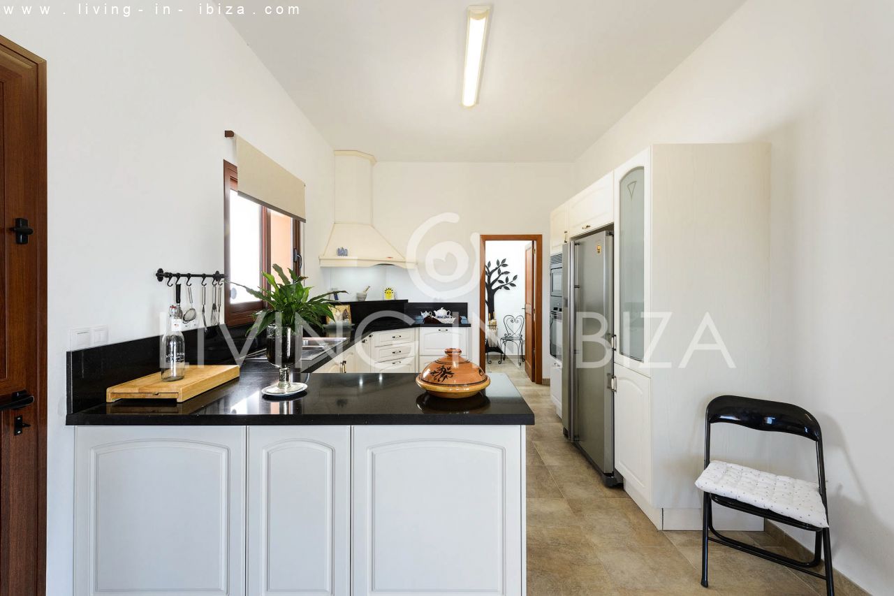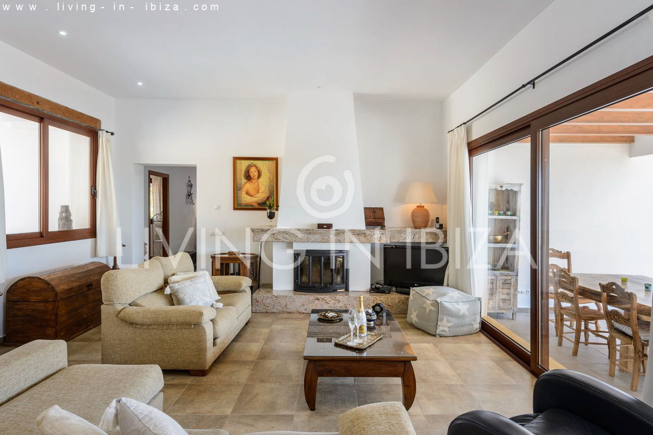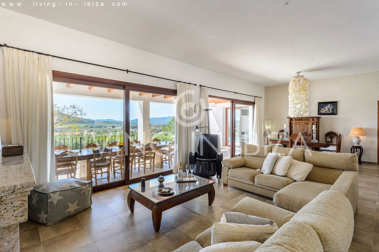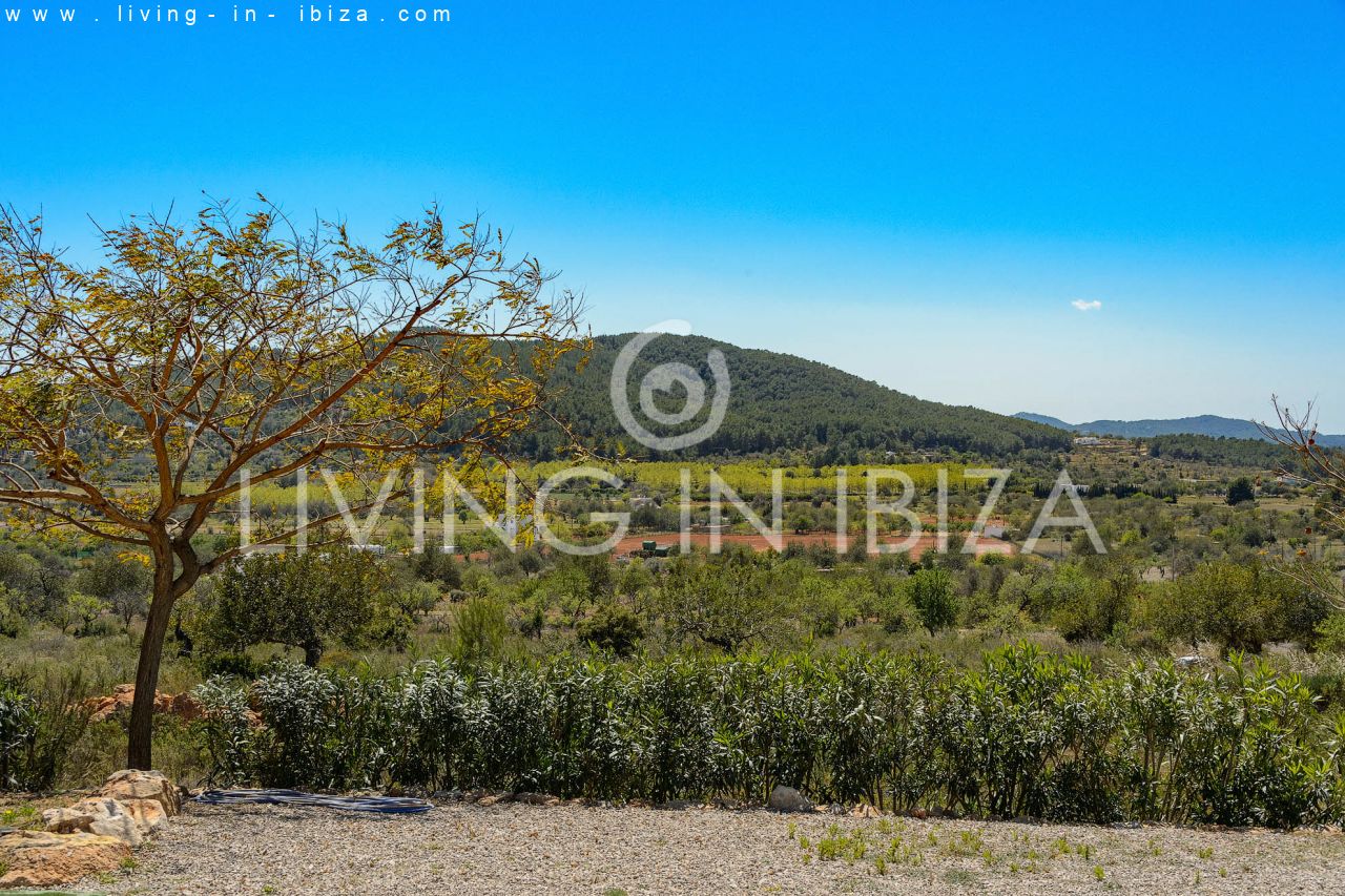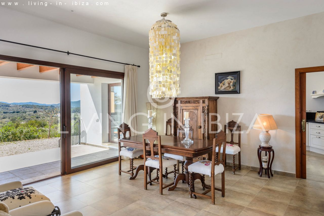 Alquiler anual / Contrato a largo plazo. Fantástico chalet en el campo con piscina, en San Carlos, Santa Eulalia del Río, Ibiza. Ubicado junto a un frondoso bosque, con magníficas vistas a valles. La casa está dividida en una vivienda principal con 3 dormitorios y 3 baños + un anexo con 2 dormitorios y un baño. Cada vivienda con su propia cocina. La propiedad de dos plantas, inmersa en la naturaleza, es el sitio ideal para una familia o una pareja que disfruta de la visita de familiares y amigos. Calefacción central y por suelo radiante. Aire acondicionado frío / calor. Salón con chimenea.