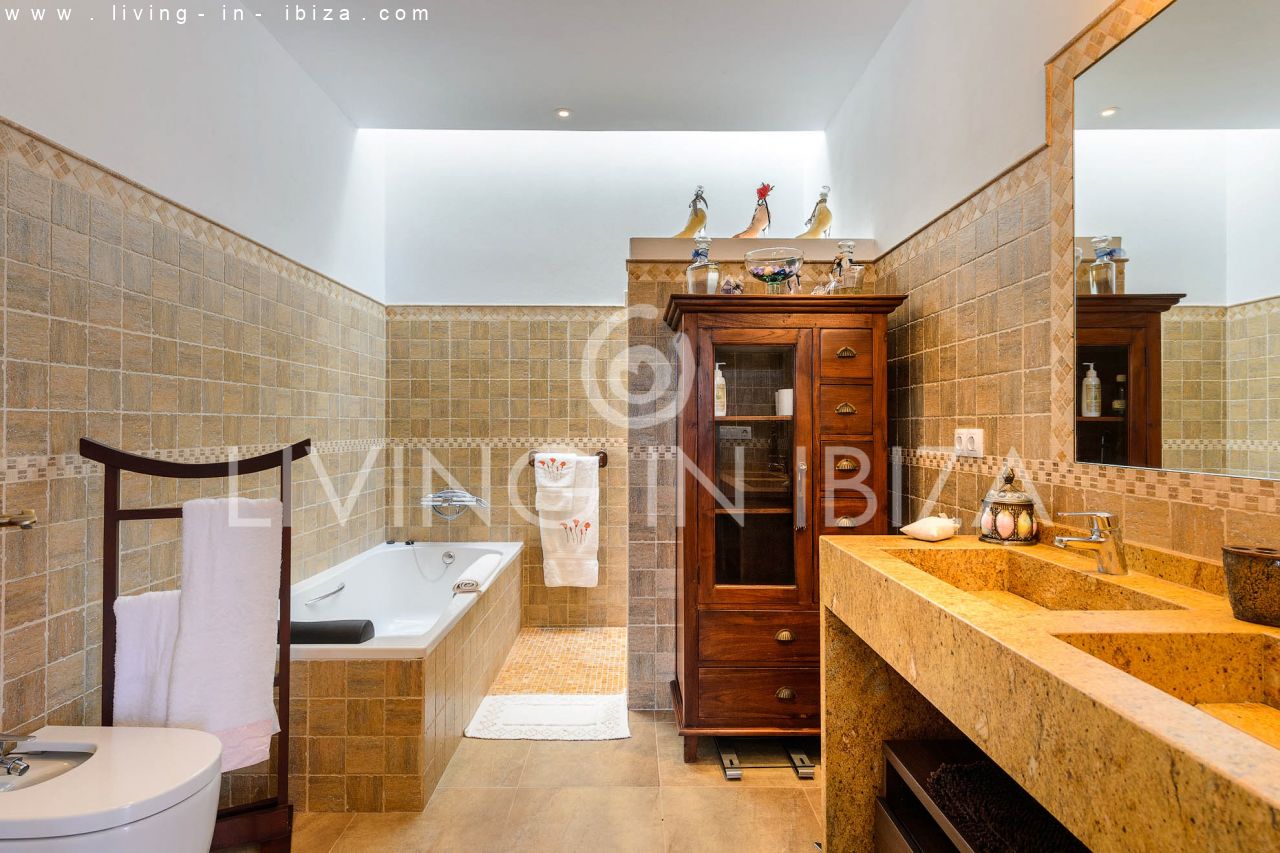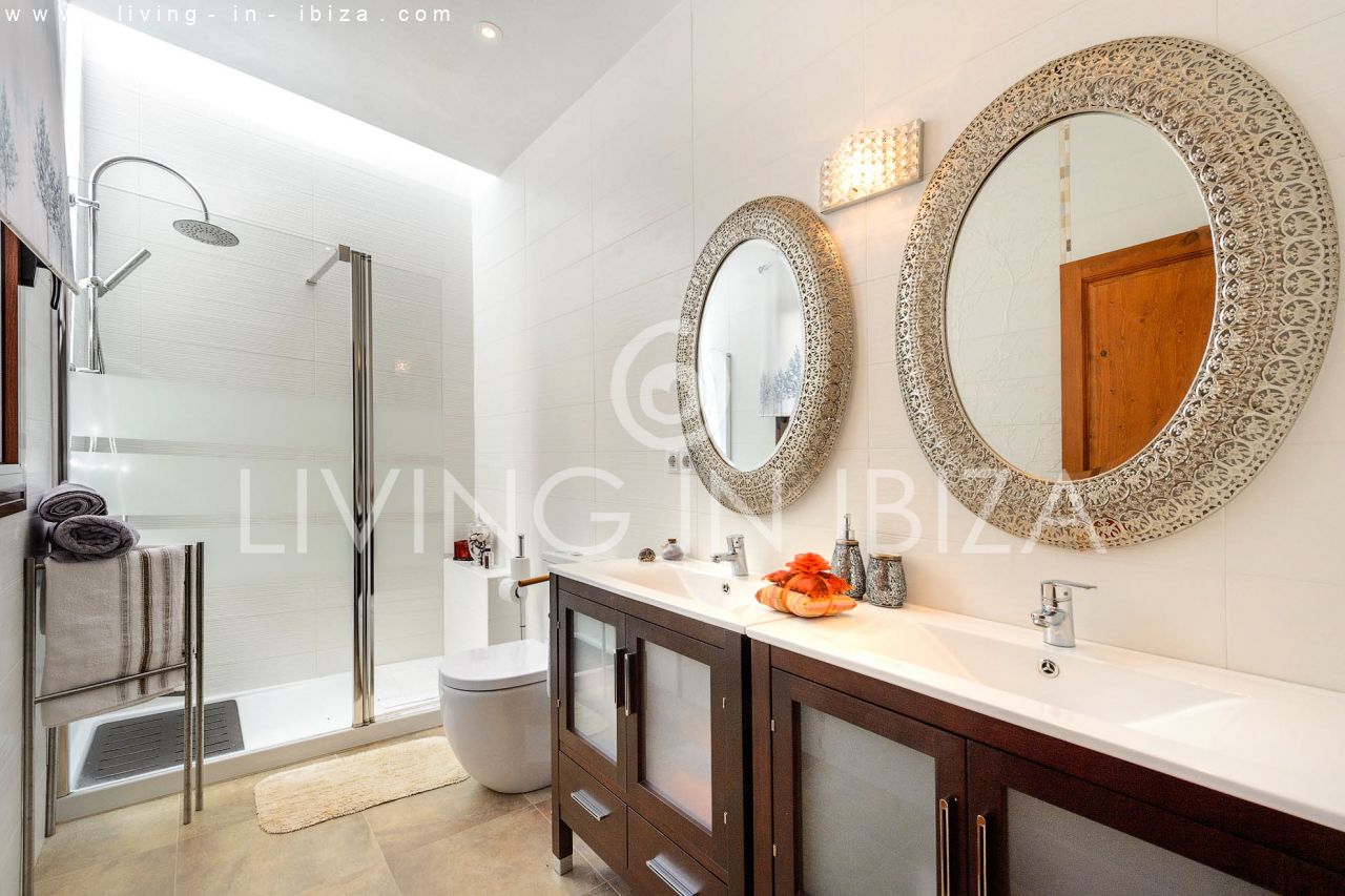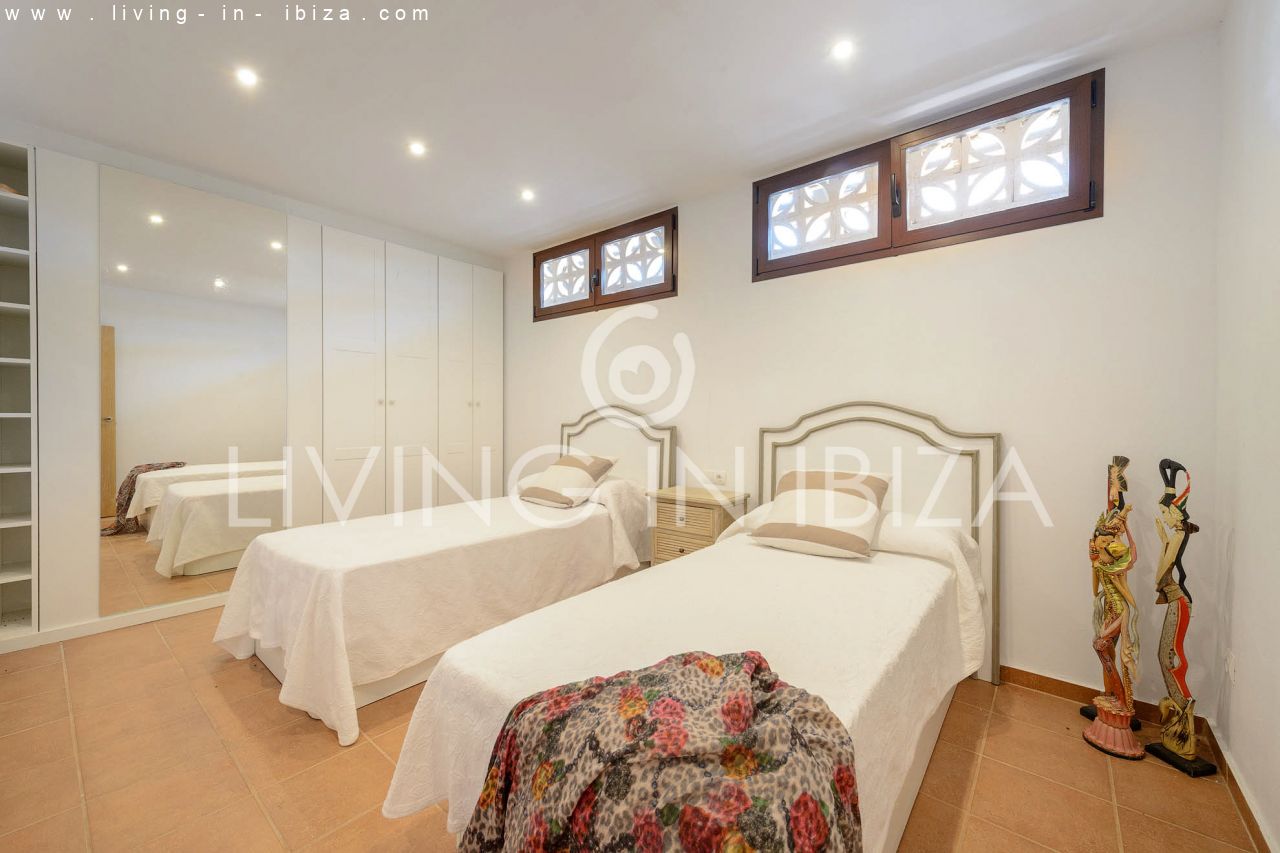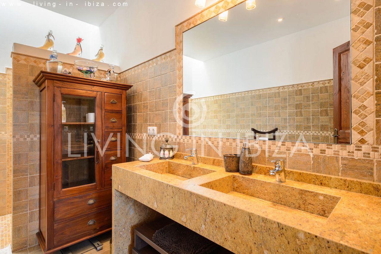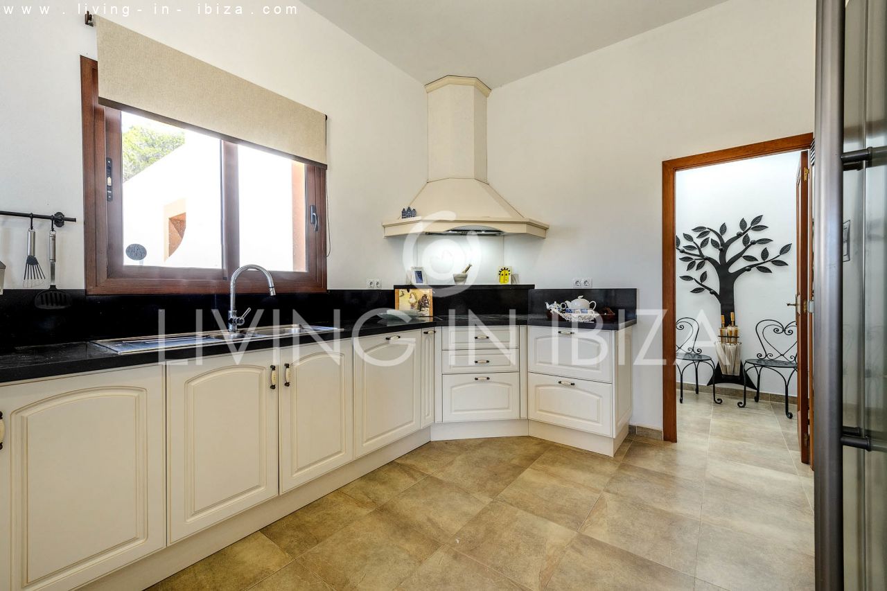 Alquiler anual / Contrato a largo plazo. Fantástico chalet en el campo con piscina, en San Carlos, Santa Eulalia del Río, Ibiza. Ubicado junto a un frondoso bosque, con magníficas vistas a valles. La casa está dividida en una vivienda principal con 3 dormitorios y 3 baños + un anexo con 2 dormitorios y un baño. Cada vivienda con su propia cocina. La propiedad de dos plantas, inmersa en la naturaleza, es el sitio ideal para una familia o una pareja que disfruta de la visita de familiares y amigos. Calefacción central y por suelo radiante. Aire acondicionado frío / calor. Salón con chimenea.