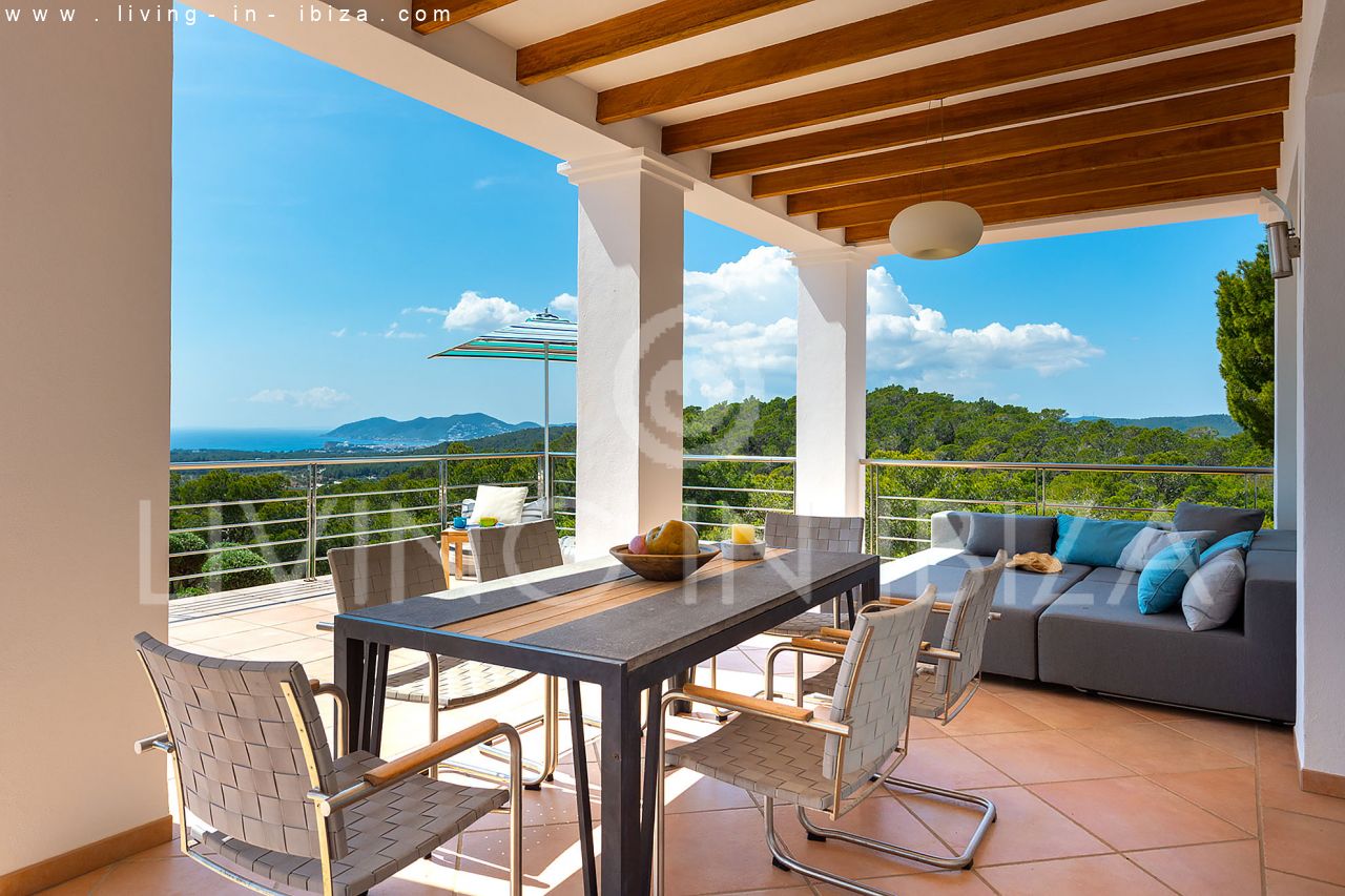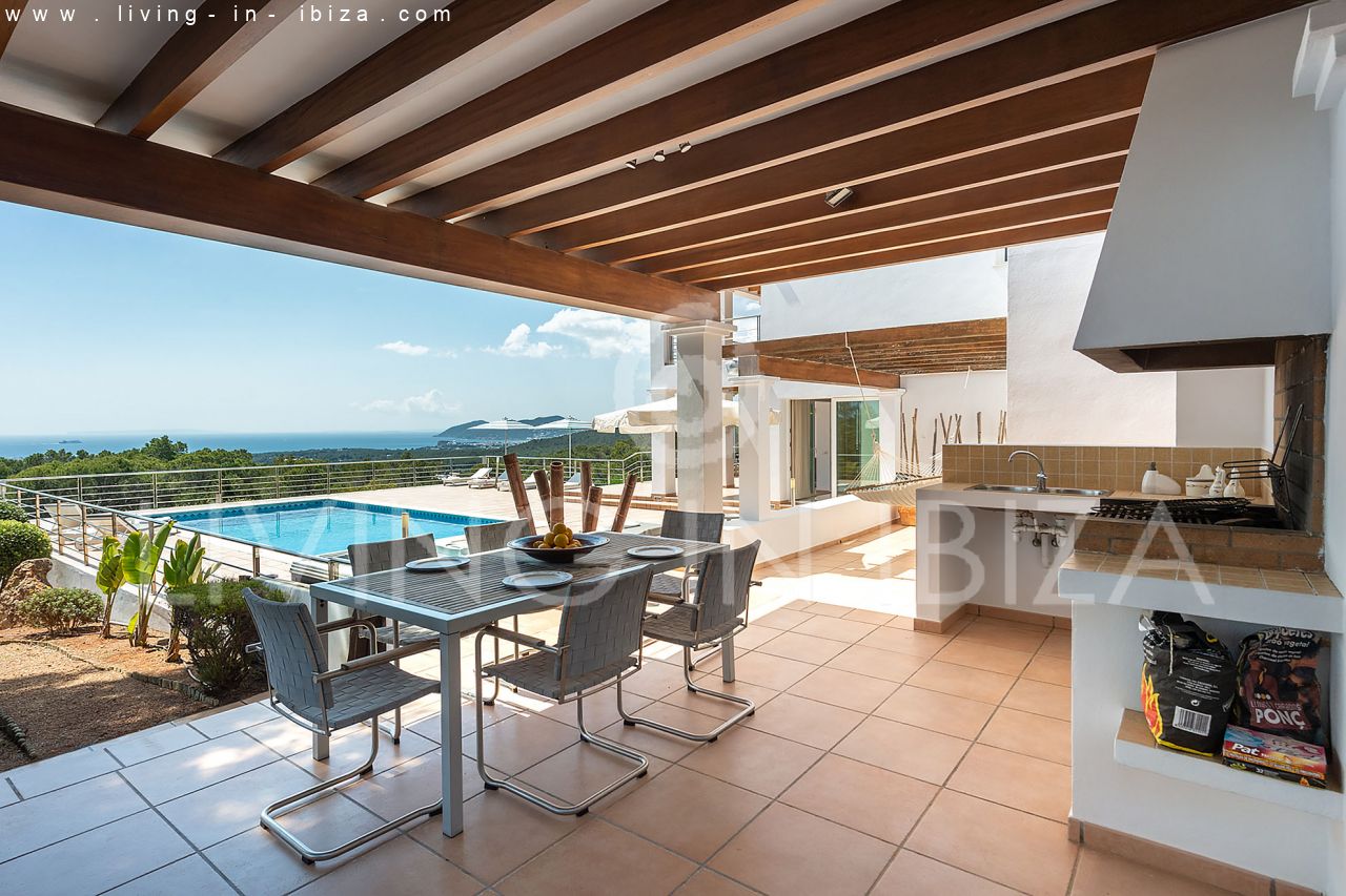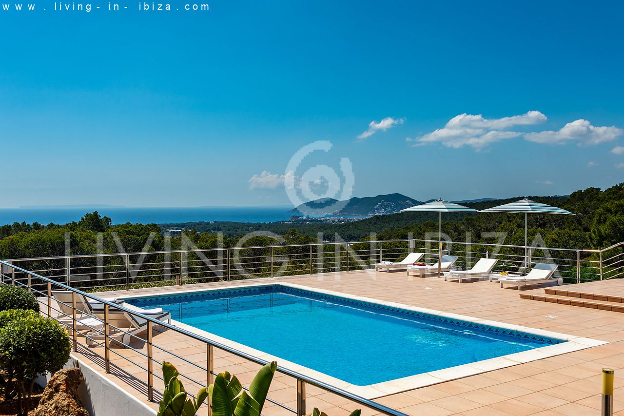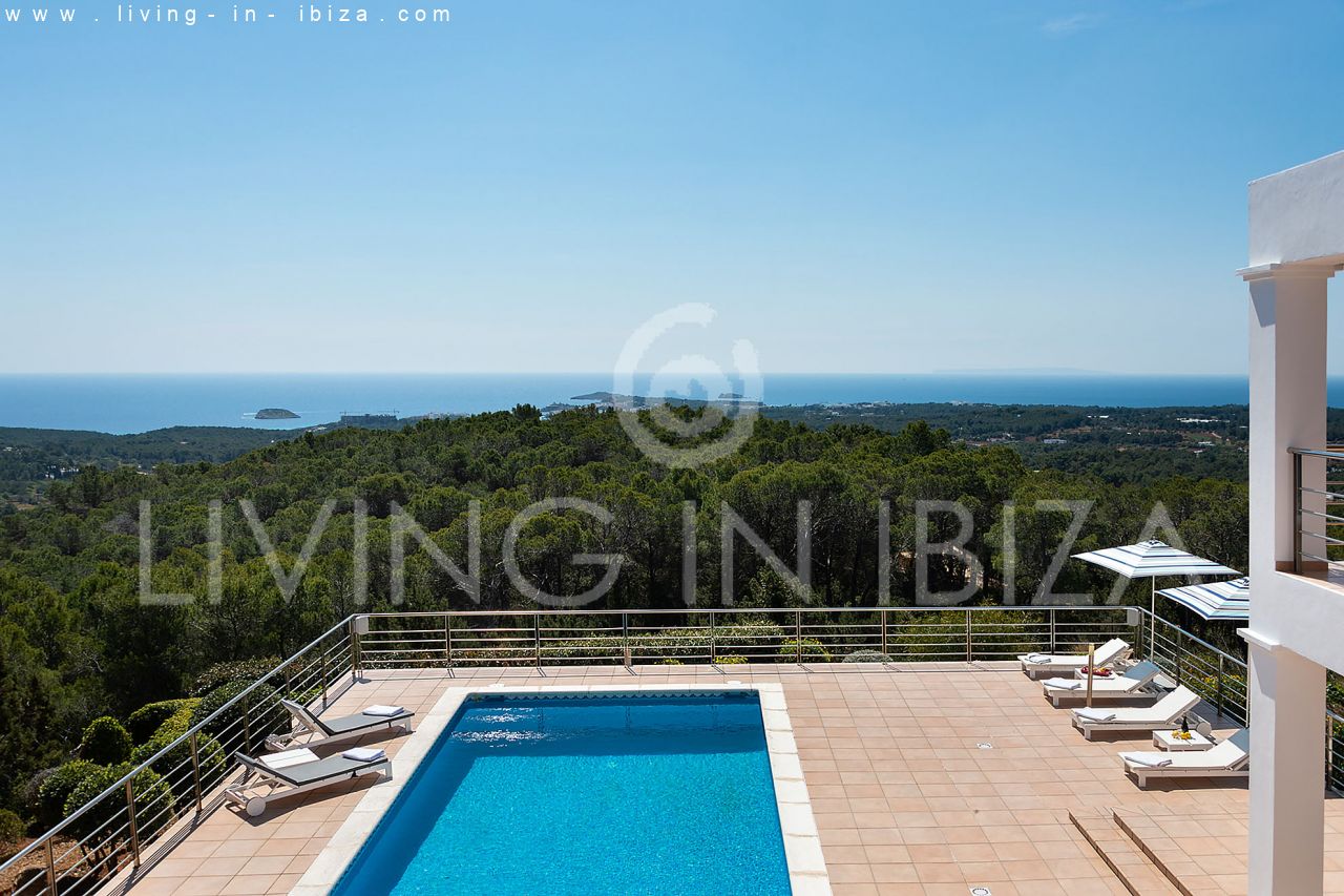 Se alquila todo el año / Contrato largo plazo. Villa Miami, cerca de San Carlos, Santa Eulalia, en Ibiza. Estilo mediterráneo, moderno con impresionantes vistas hacia el mar y zonas verdes. Piscina, varias terrazas, barbacoa, terraza cubierta. Doble acristalamiento, aberturas de aluminio. Apartamento de invitados. Garaje. Orientación sur. Calefacción central. Aire acondicionado frío/calor.