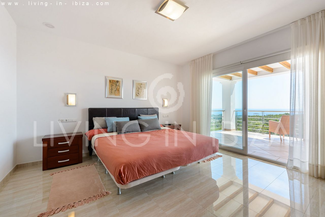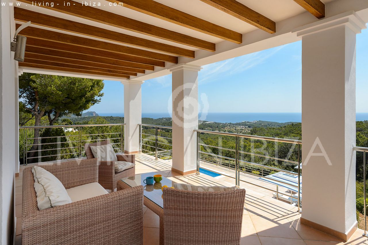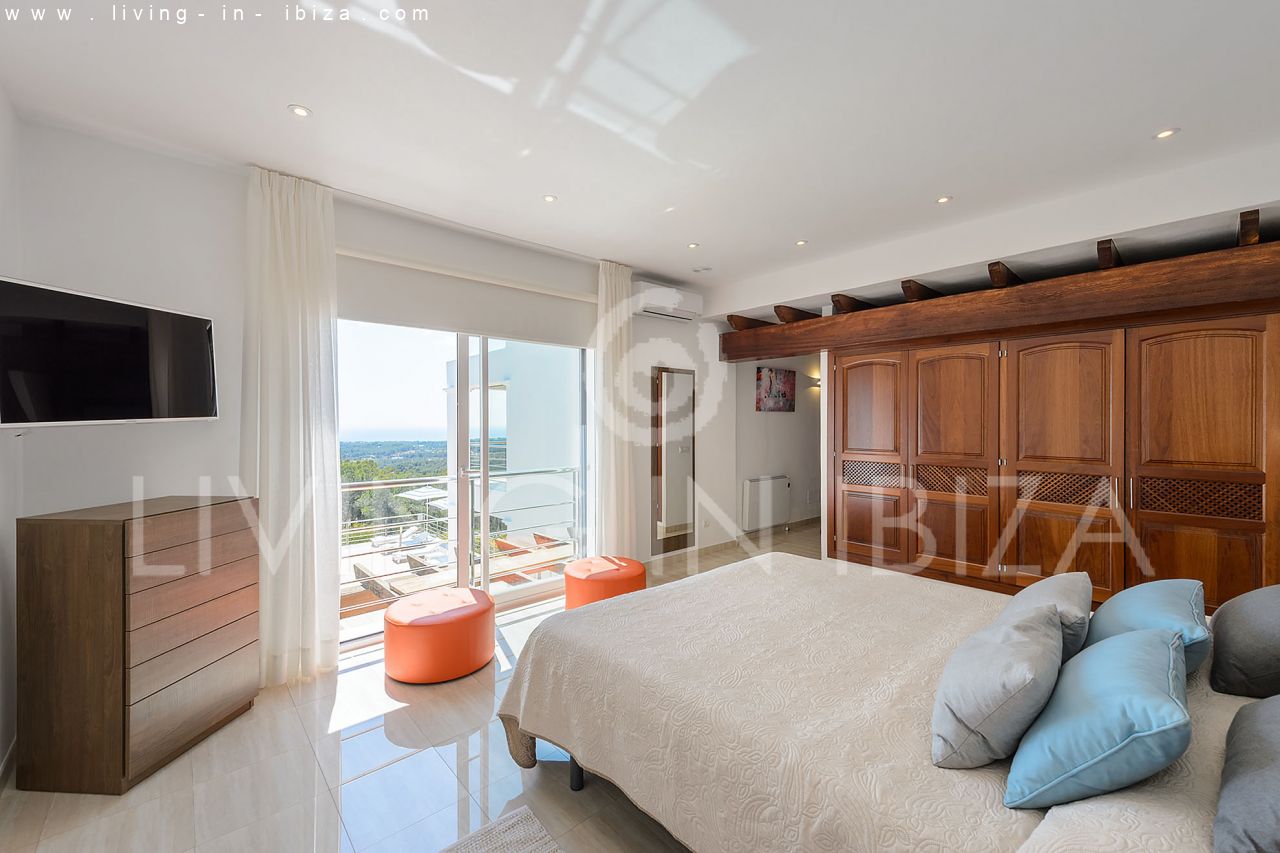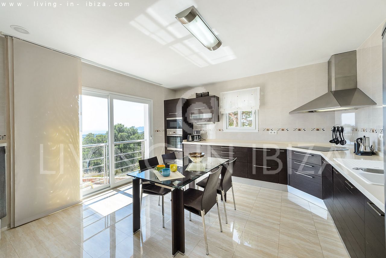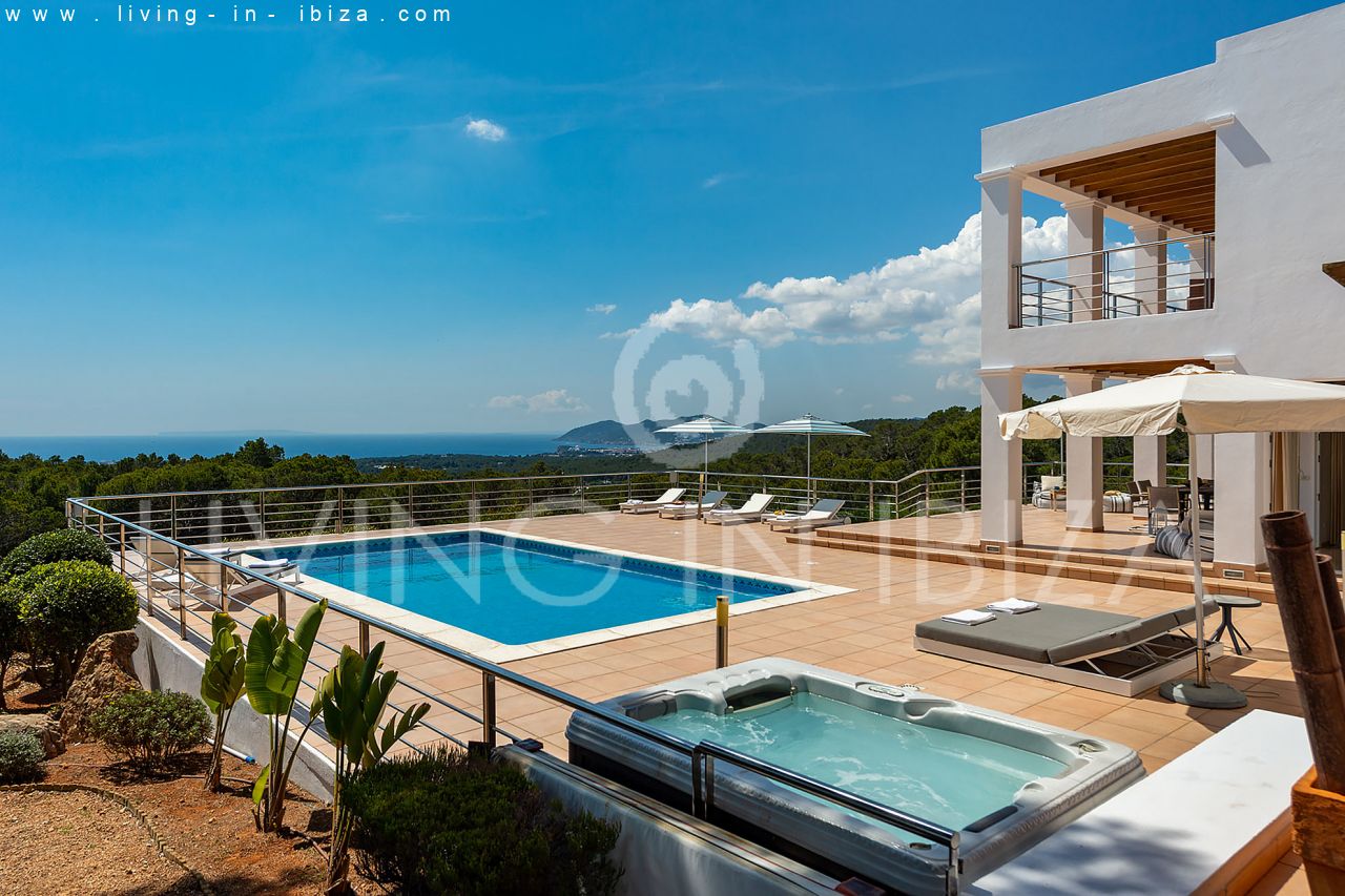 Se alquila todo el año / Contrato largo plazo. Villa Miami, cerca de San Carlos, Santa Eulalia, en Ibiza. Estilo mediterráneo, moderno con impresionantes vistas hacia el mar y zonas verdes. Piscina, varias terrazas, barbacoa, terraza cubierta. Doble acristalamiento, aberturas de aluminio. Apartamento de invitados. Garaje. Orientación sur. Calefacción central. Aire acondicionado frío/calor.
