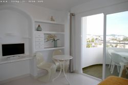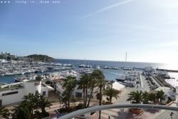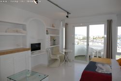 Alquiler temporal, studio con vista al mar en primera línea frente al puerto deportivo y sobre el Paseo Marítimo de Santa Eulalia, Ibiza.