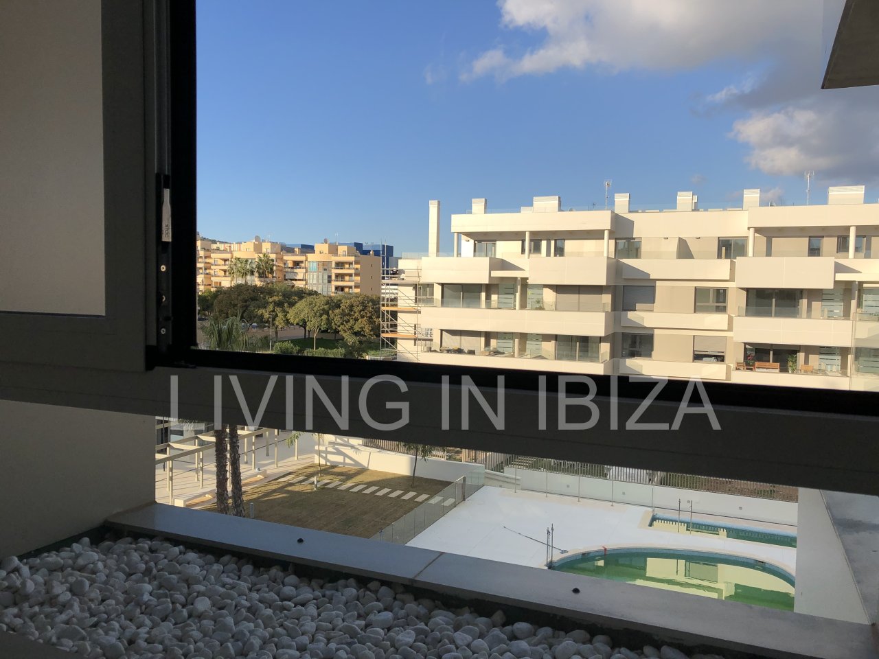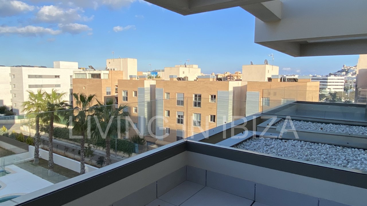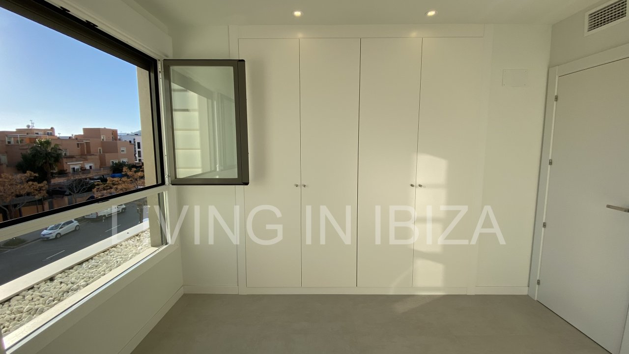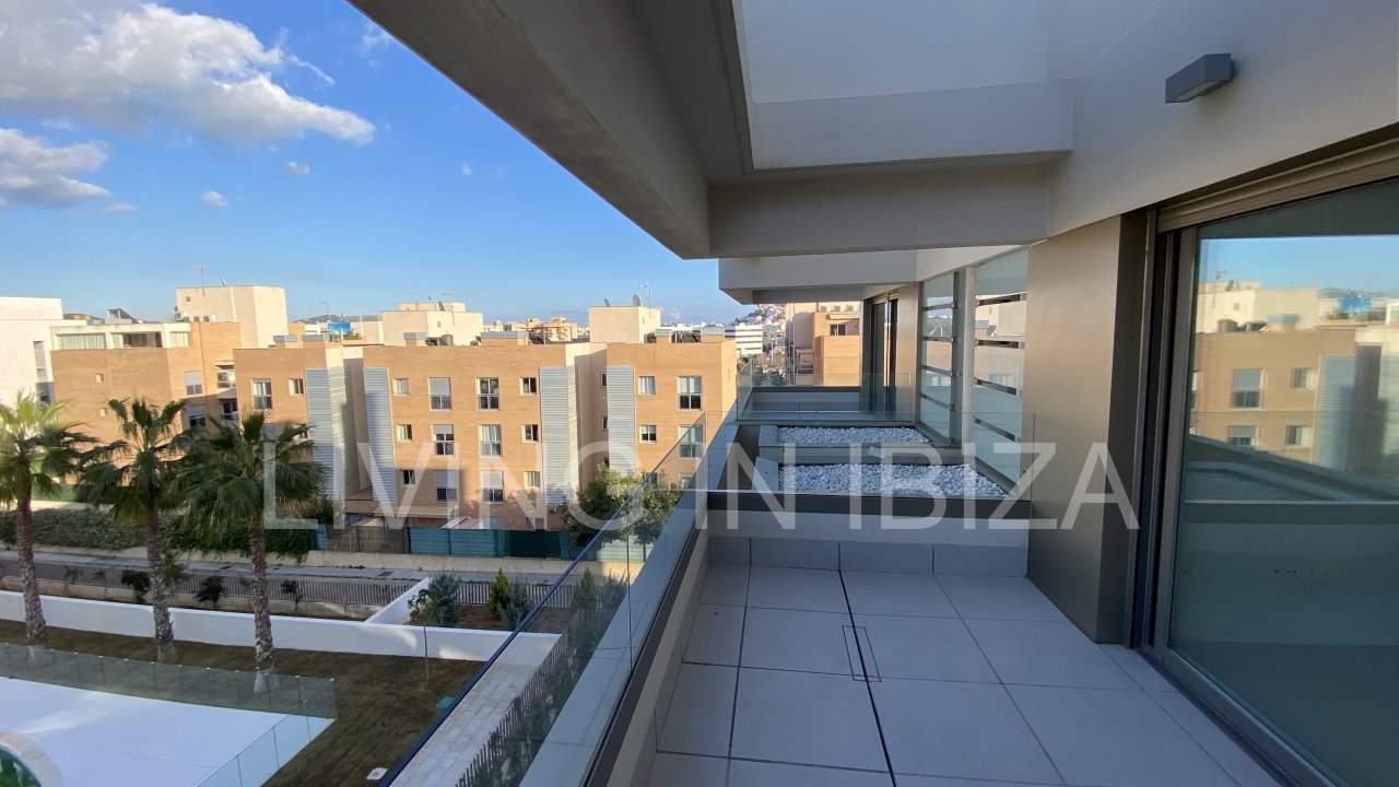 Se alquila anualmente. Piso amplio, moderno y sin amueblar disponible a partir del 1 de julio en Can Urban. Cuenta con dos plazas de aparcamiento (una incluida en el precio y otra opcional), un trastero y un balcón con vistas lejanas a Dalt Vila y a la piscina comunitaria.