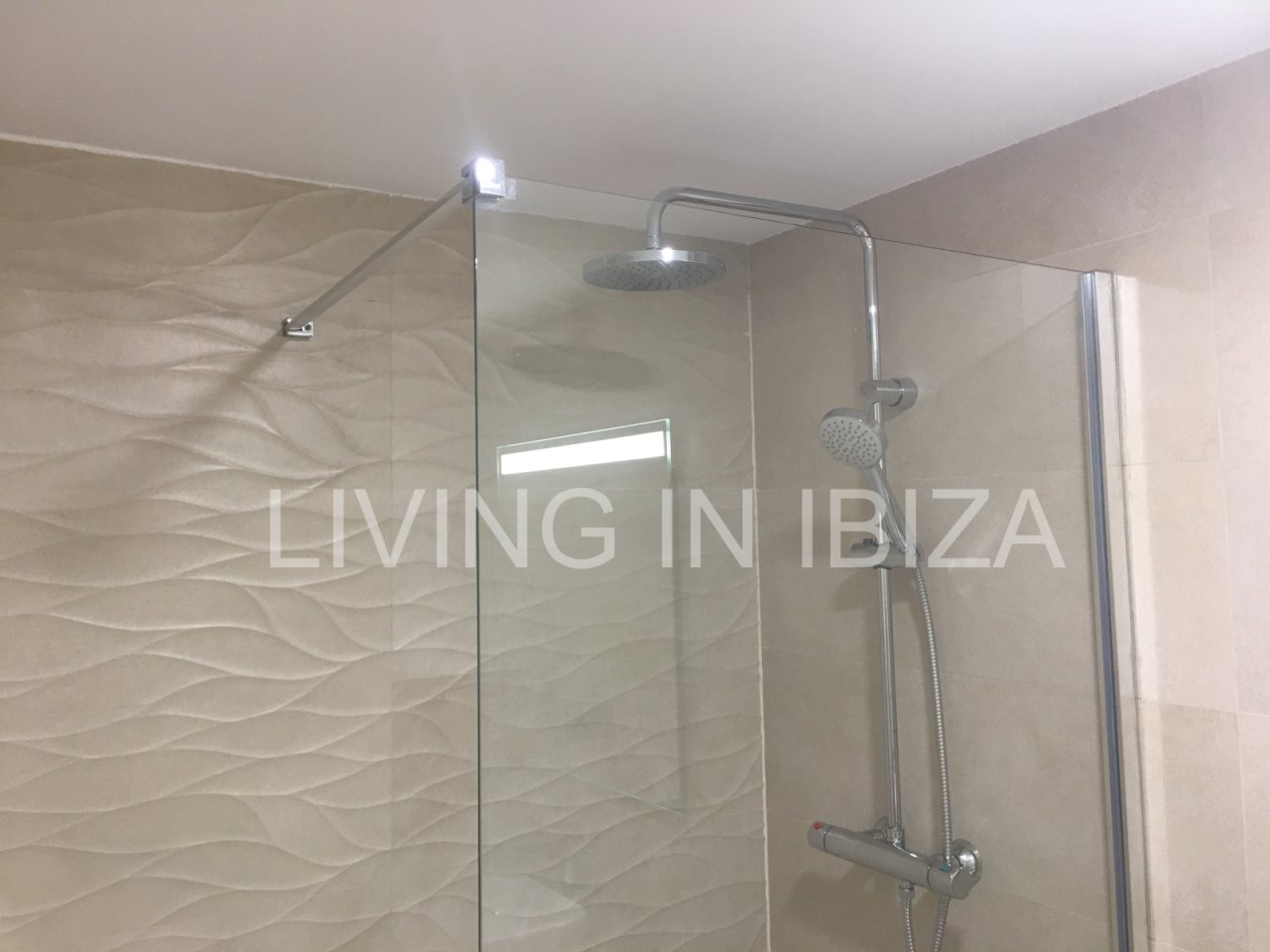 Este ático tiene dos habitaciones y dos baños, uno de ellos en suite, salón comedor con cocina abierta y acceso a una terraza cubierta de aproximadamente 10,5 m^(2), desde la cual se accede a una terraza en la azotea de unos 76,5 m^(2). También tiene una plaza de aparcamiento y un trastero en el sótano del mismo edificio. Tiene vistas al Puig de Missa, a las colinas y al mar, y desde la terraza se puede ver el islote de Tagomago.