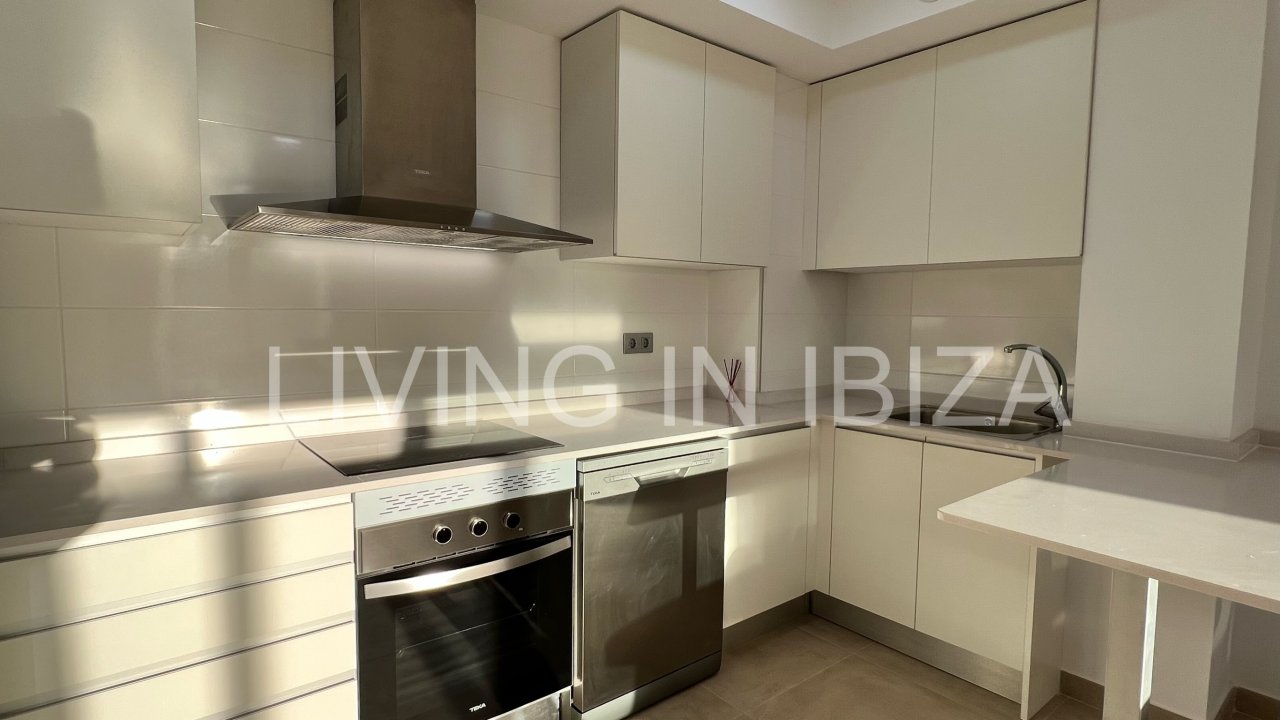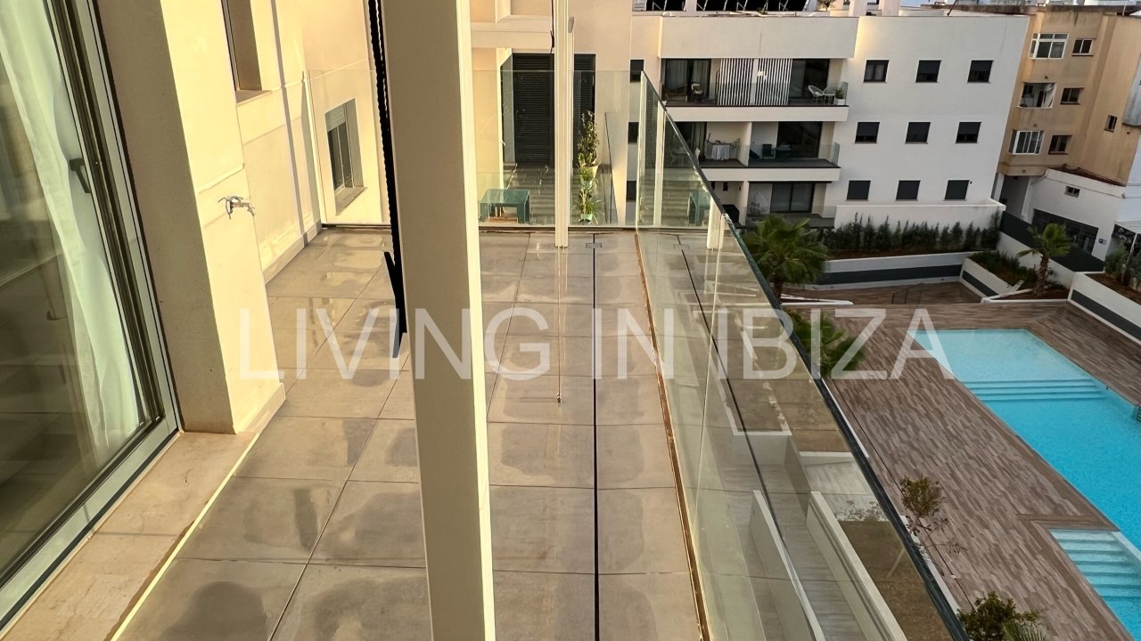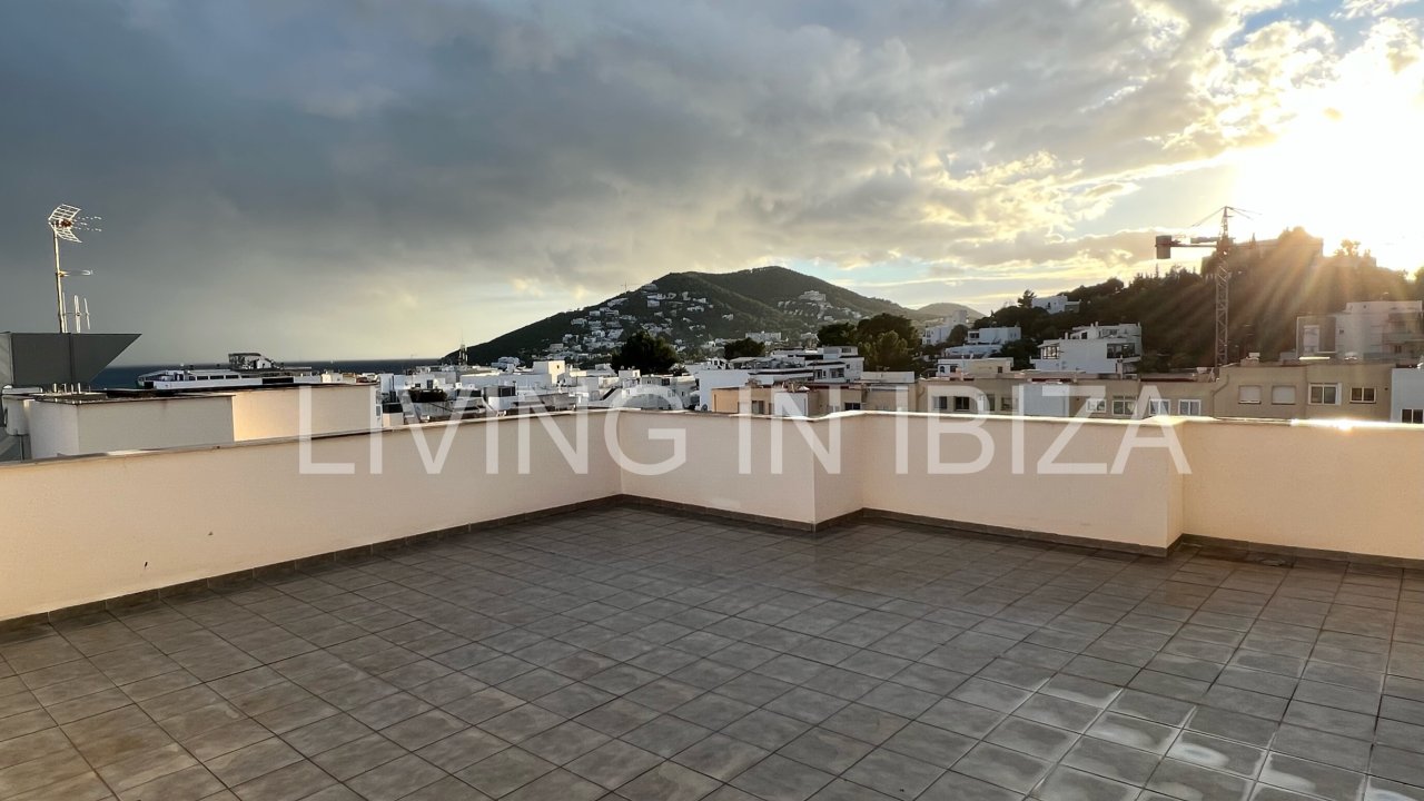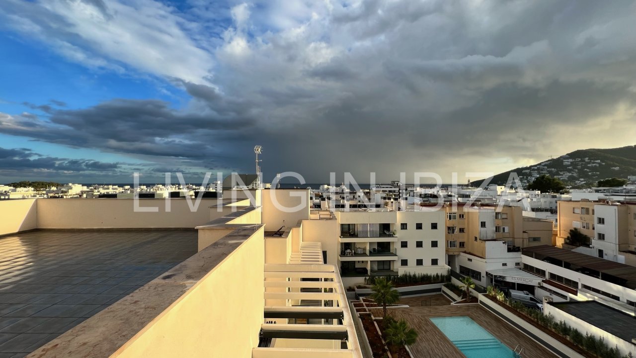 Penthouse Bahía en alquiler anual a largo plazo. Este atractivo y moderno ático está como nuevo y se encuentra en una urbanización de lujo de reciente construcción en la ciudad de Santa Eulalia del Río. Tiene una fantástica terraza privada en la azotea con vistas al mar, piscina comunitaria, una plaza de aparcamiento y un trastero en el sótano del mismo edificio.