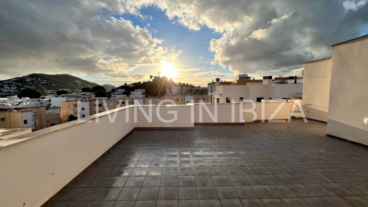 El ático se distribuye en dos habitaciones y dos baños (uno de ellos en suite), salón comedor con cocina abierta y acceso a una terraza descubierta. En un lateral de esta terraza hay una puerta que da acceso a un lavadero cubierto. Desde esta terraza se sube por una escalera interna a una terraza descubierta en la azotea, desde donde se aprecian vistas abiertas al Puig de Missa, la ciudad de Santa Eulalia, las colinas y el mar a lo lejos.