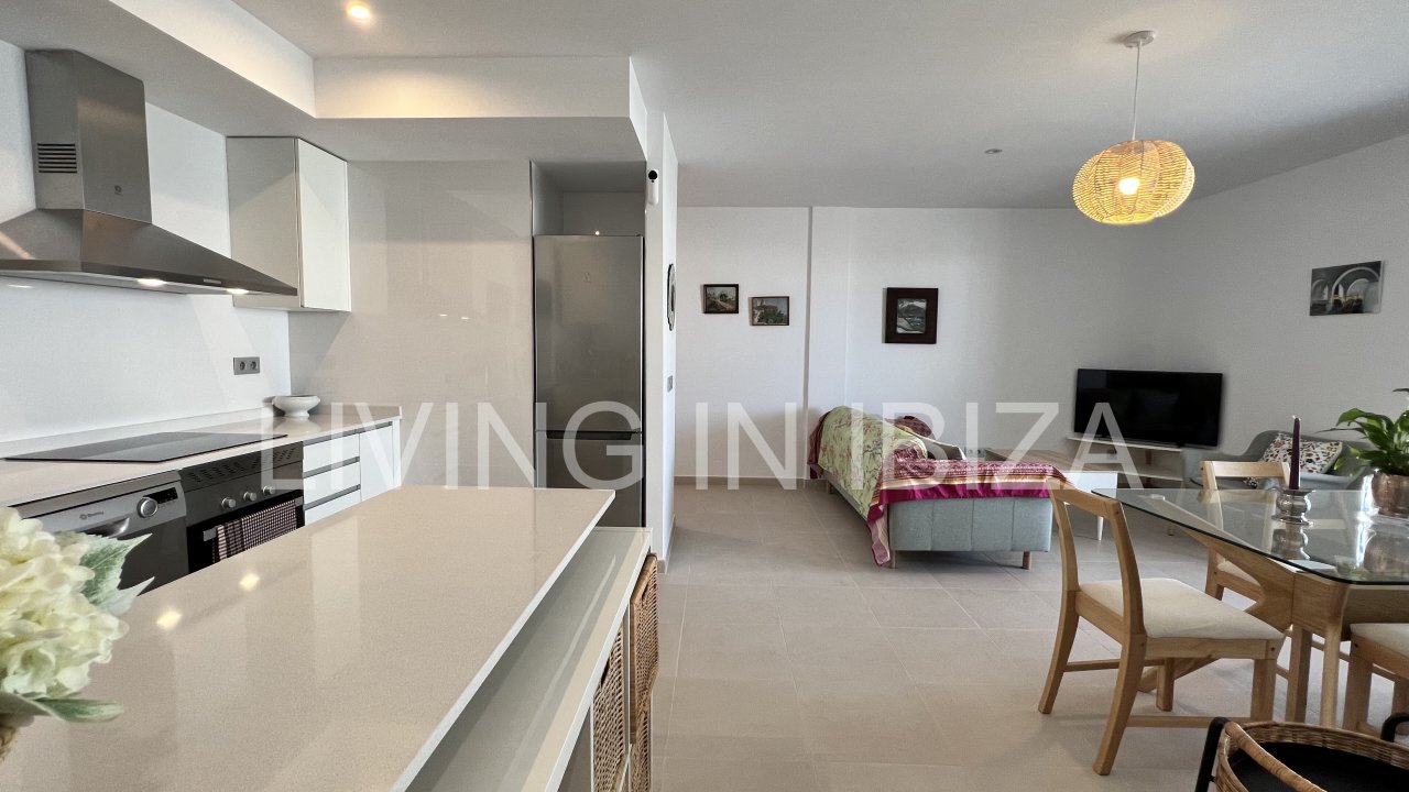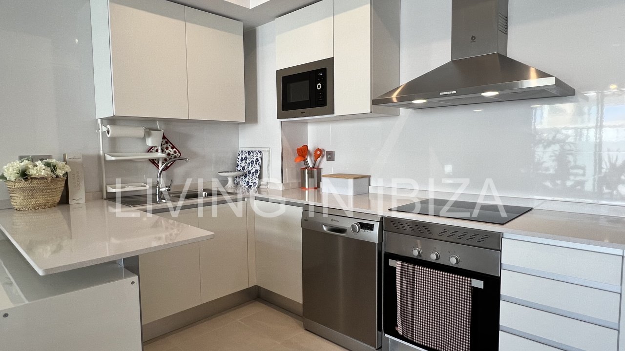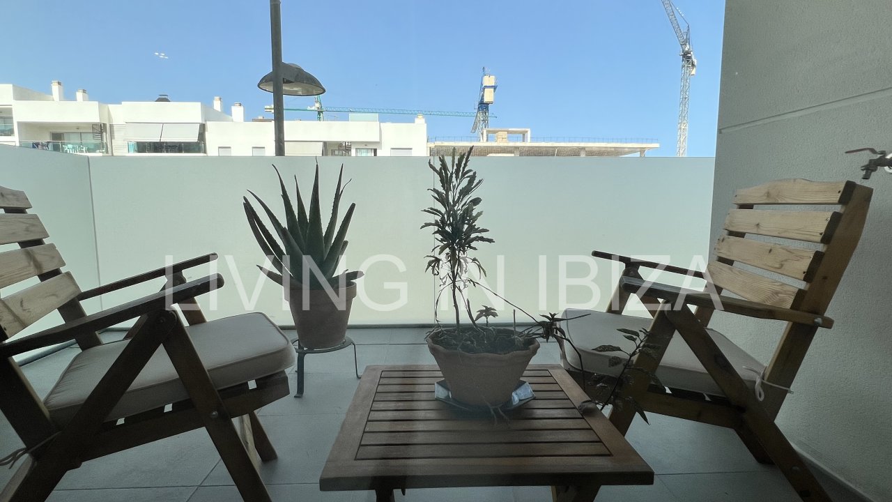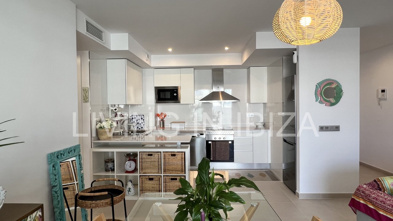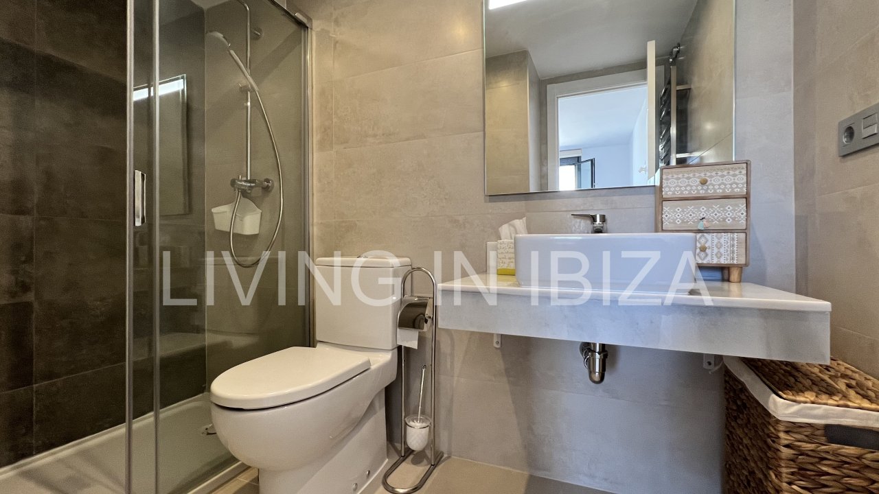 Este fantástico piso es ideal para vivir toda la temporada de verano. También ofrece una solución práctica para aquellos amantes de Ibiza que deseen tener un pied-à- terre en la isla de Ibiza dentro de una de las ciudades de la isla en donde encontrará actividad durante todo el año. A pocos pasos de la parada de autobús, restaurantes, negocios, cine, farmacias, parada de taxis, correo, mercado, supermercados y la maravillosa playa de arena, donde podrá practicar varios deportes acuáticos.