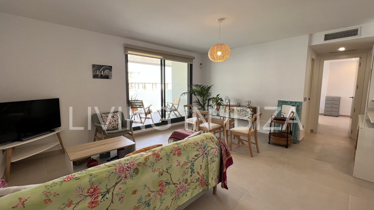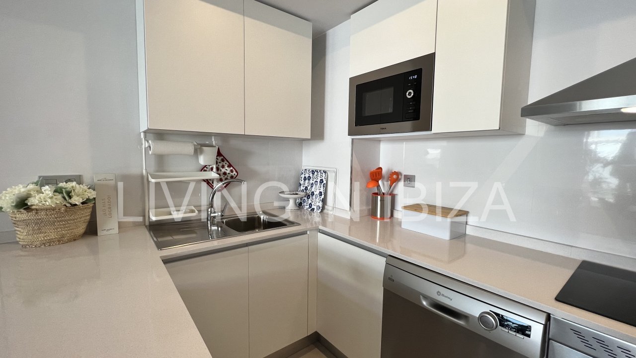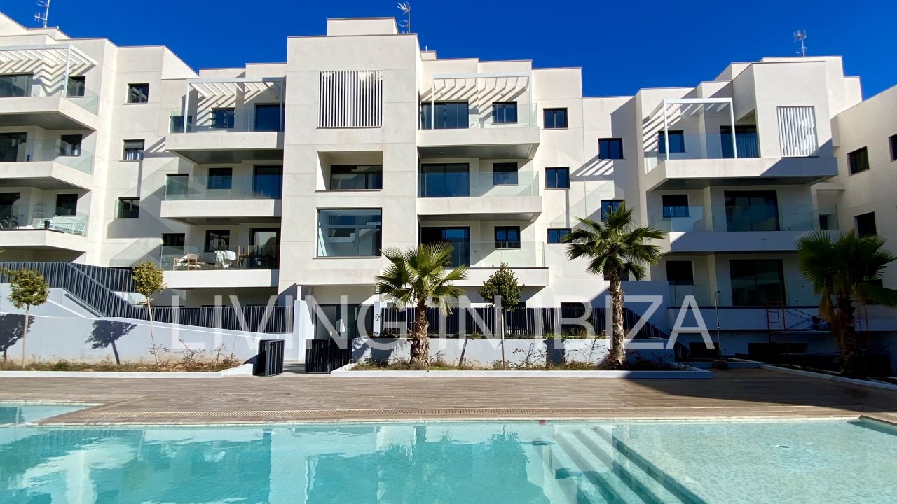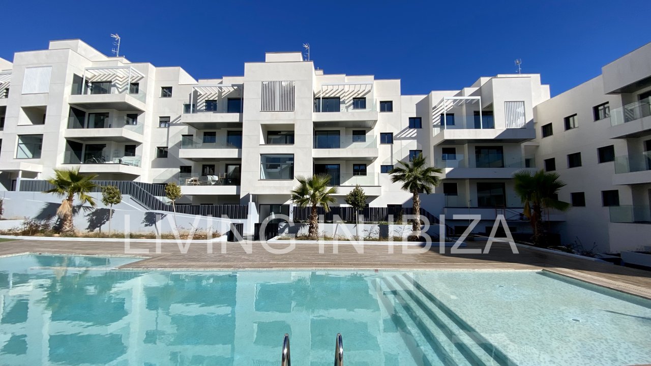 TEMPORADA 2026. Este atractivo y moderno piso se encuentra nuevo a estrenar en una urbanización de lujo en Santa Eulalia del Río, Ibiza. Piscina com.