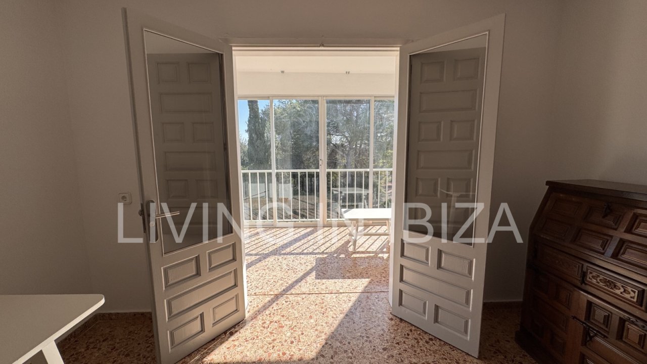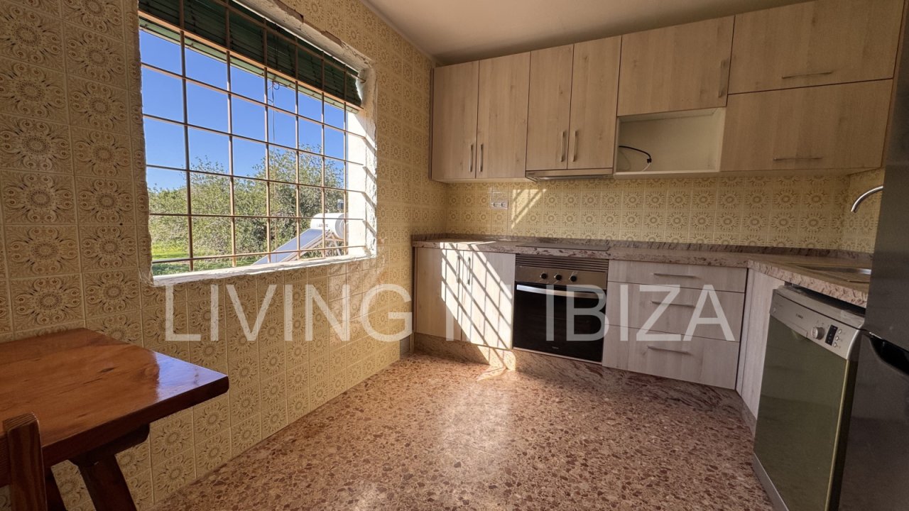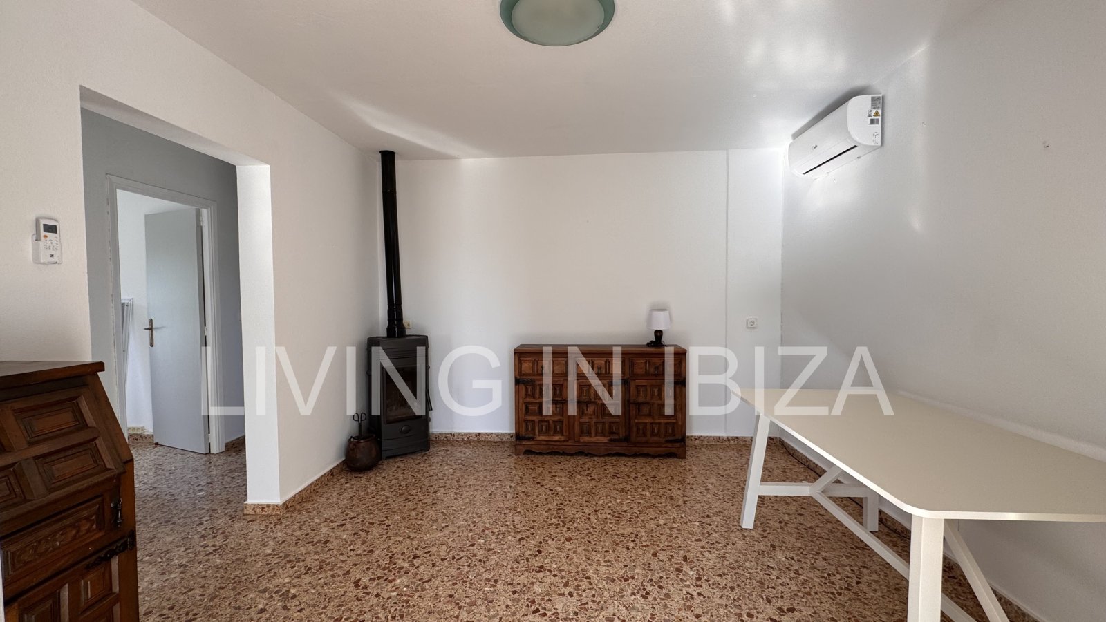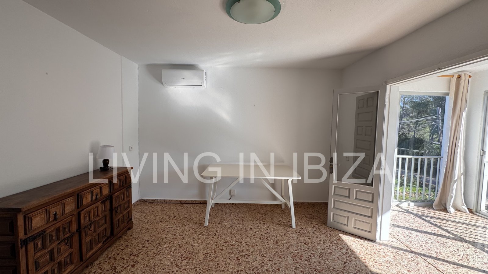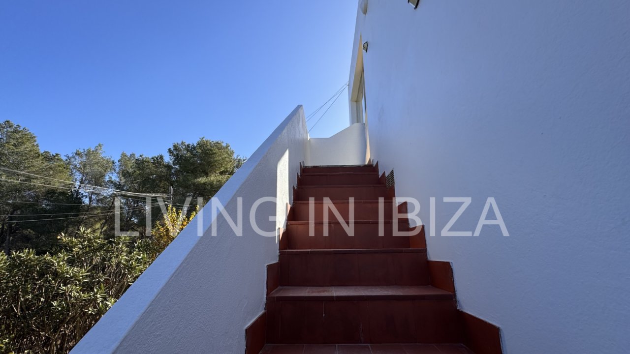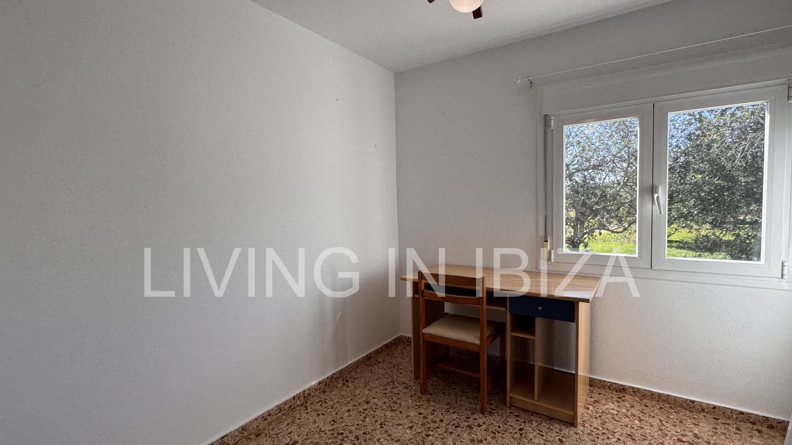ALQUILER ANUAL. Se alquila anualmente. Casa de un primer piso ubicada en el campo, con acceso por escalera exterior, en la zona de Cala Pada, en Santa Eulalia del Río (Ibiza). Tiene tres dormitorios, dos baños y jardín propio. Disponible a partir de mayo de 2025.