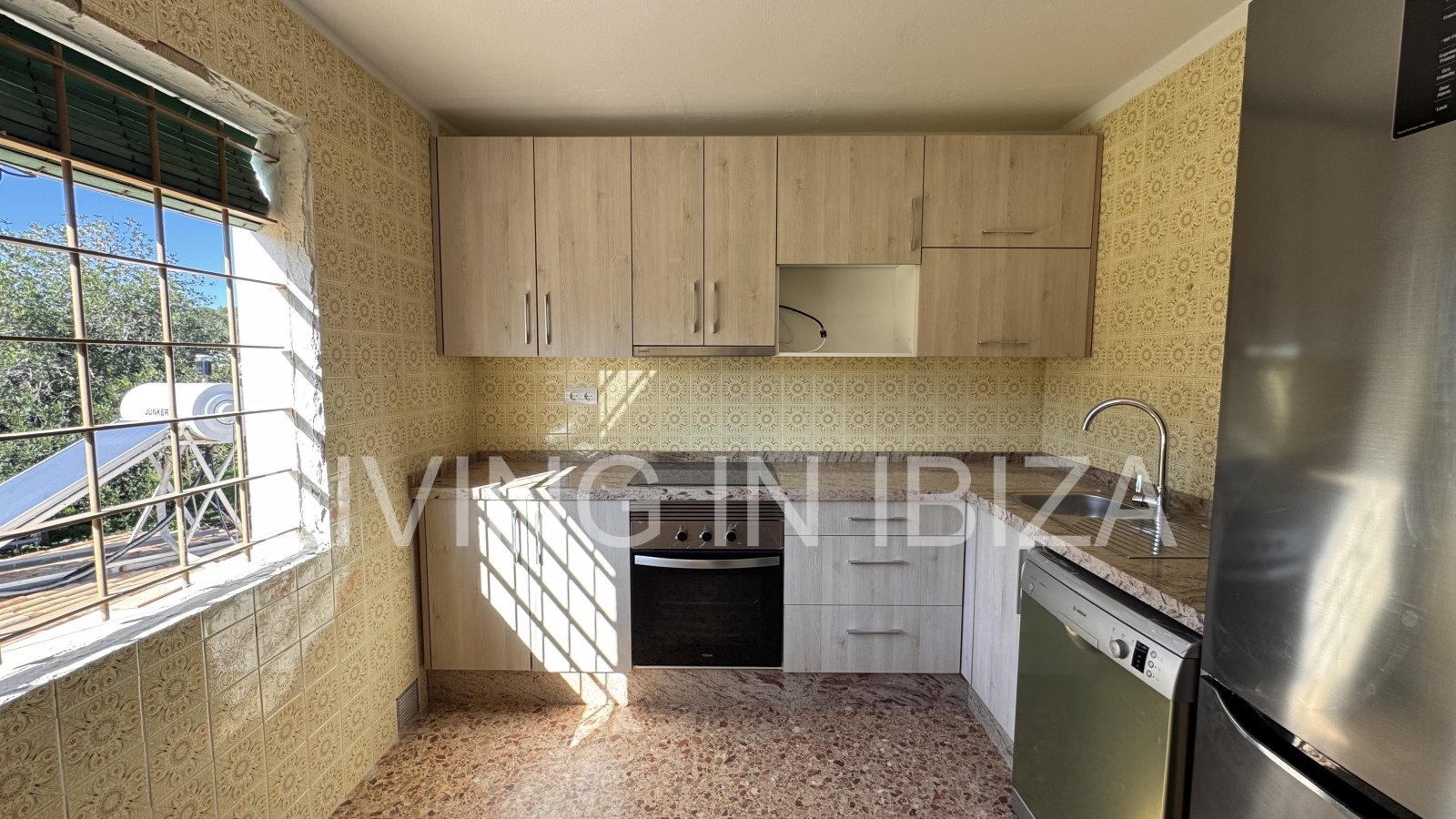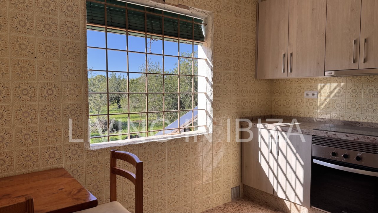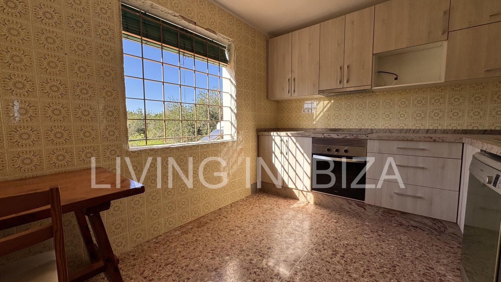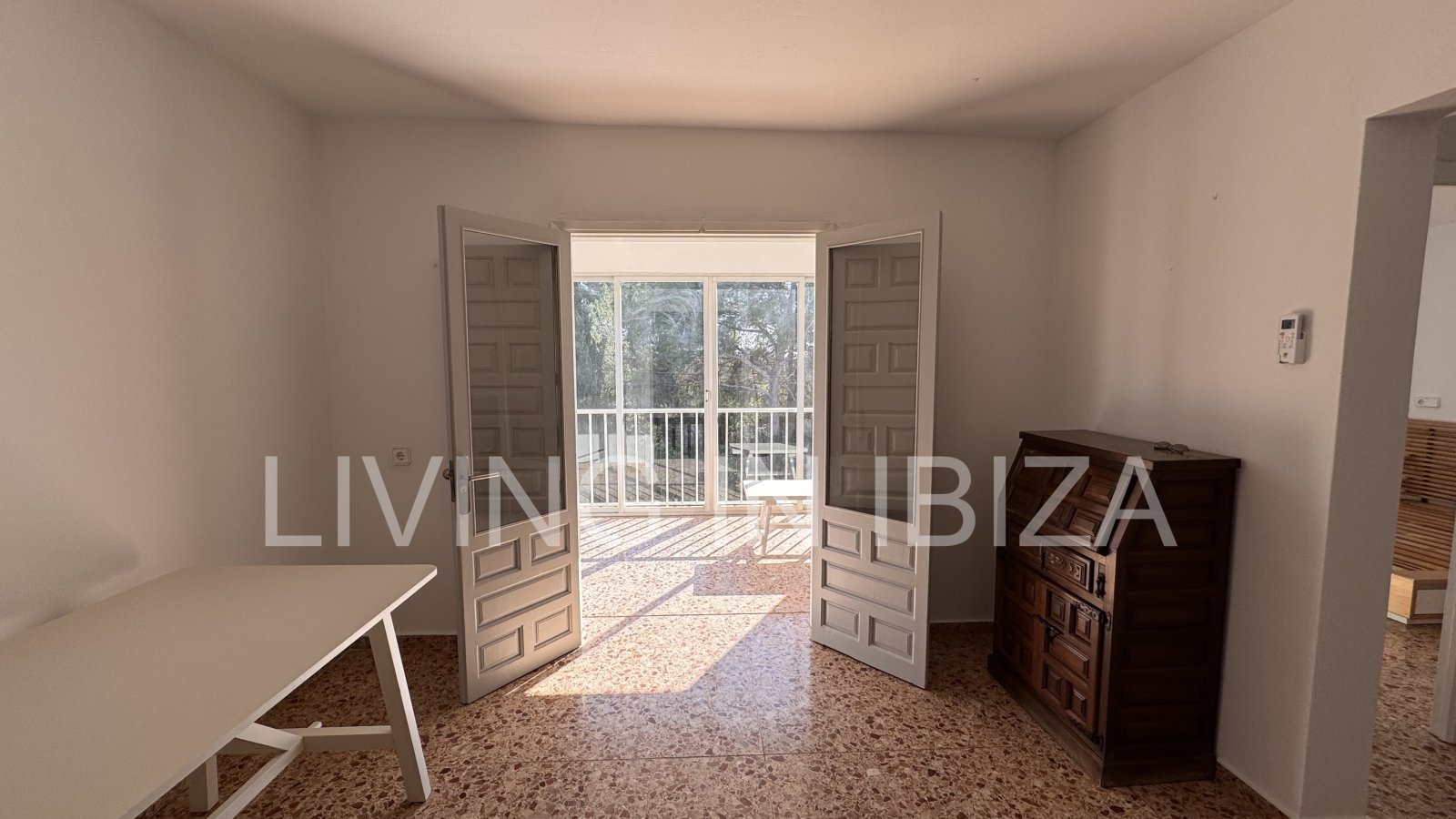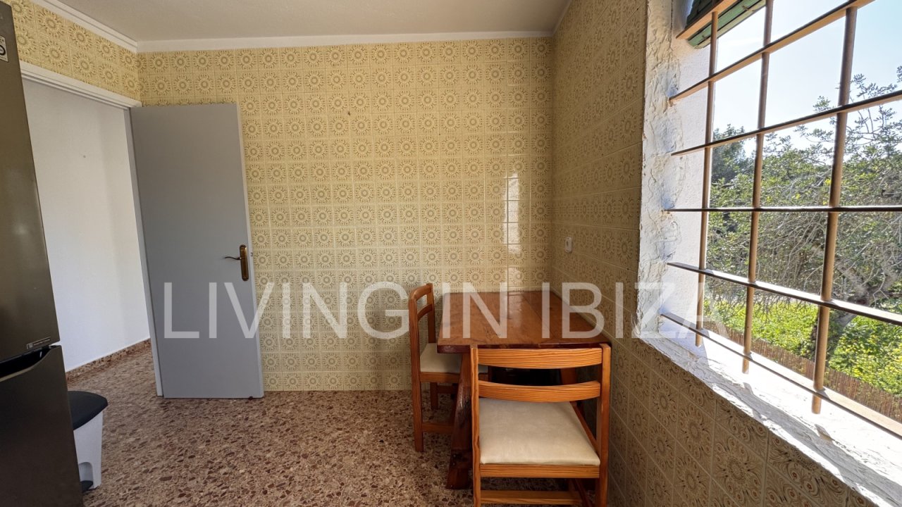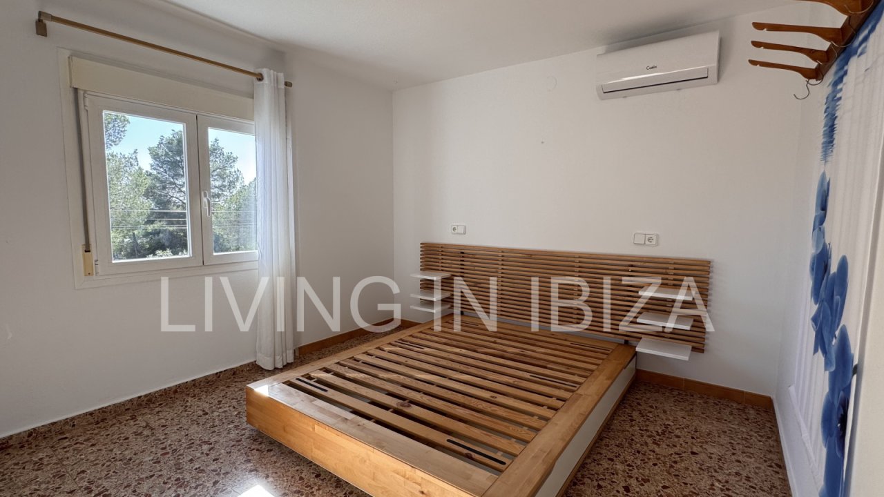 ALQUILER ANUAL. Se alquila anualmente. Casa de un primer piso ubicada en el campo, con acceso por escalera exterior, en la zona de Cala Pada, en Santa Eulalia del Río (Ibiza). Tiene tres dormitorios, dos baños y jardín propio. Disponible a partir de mayo de 2025.
