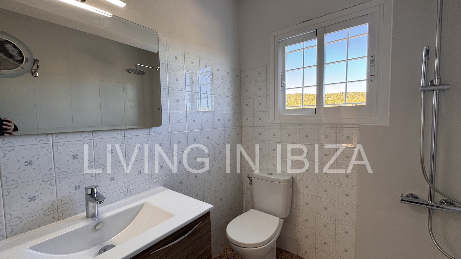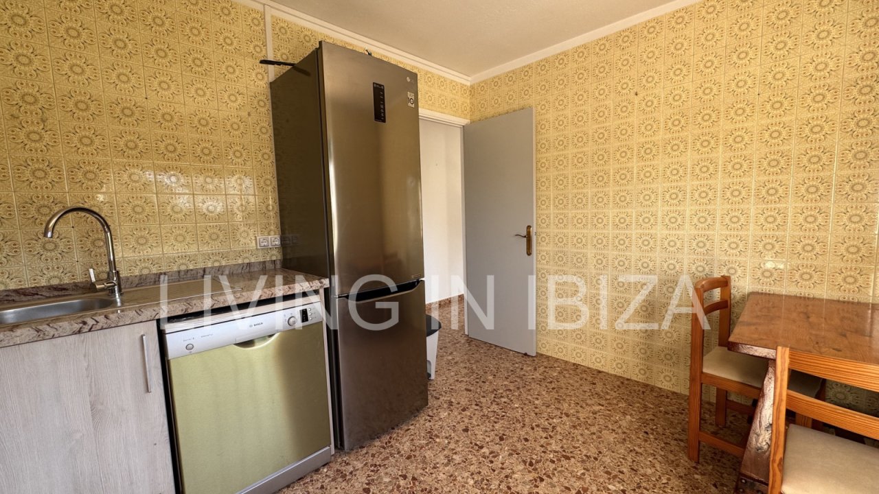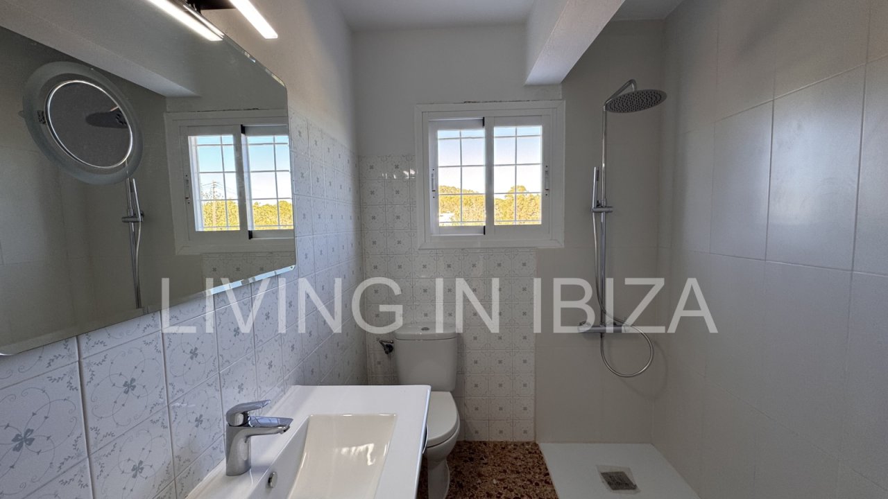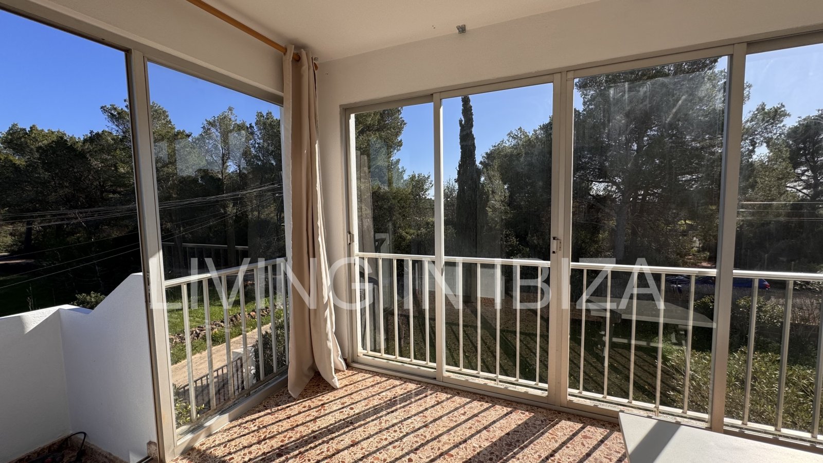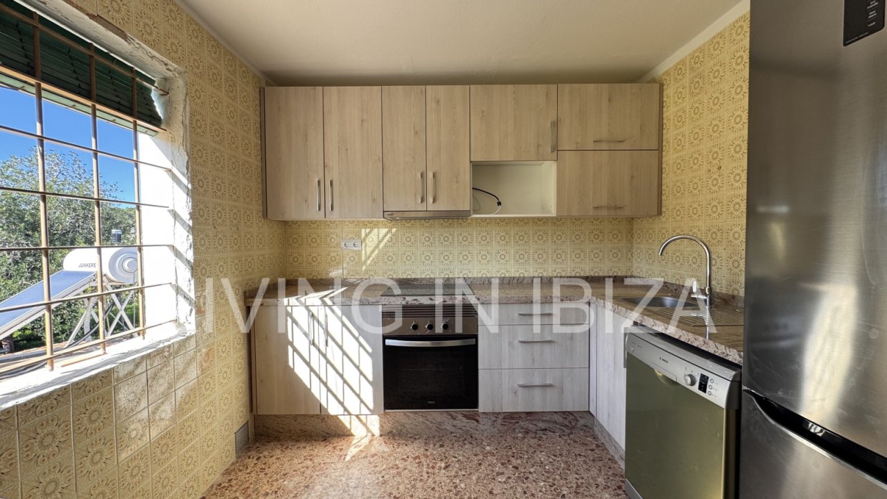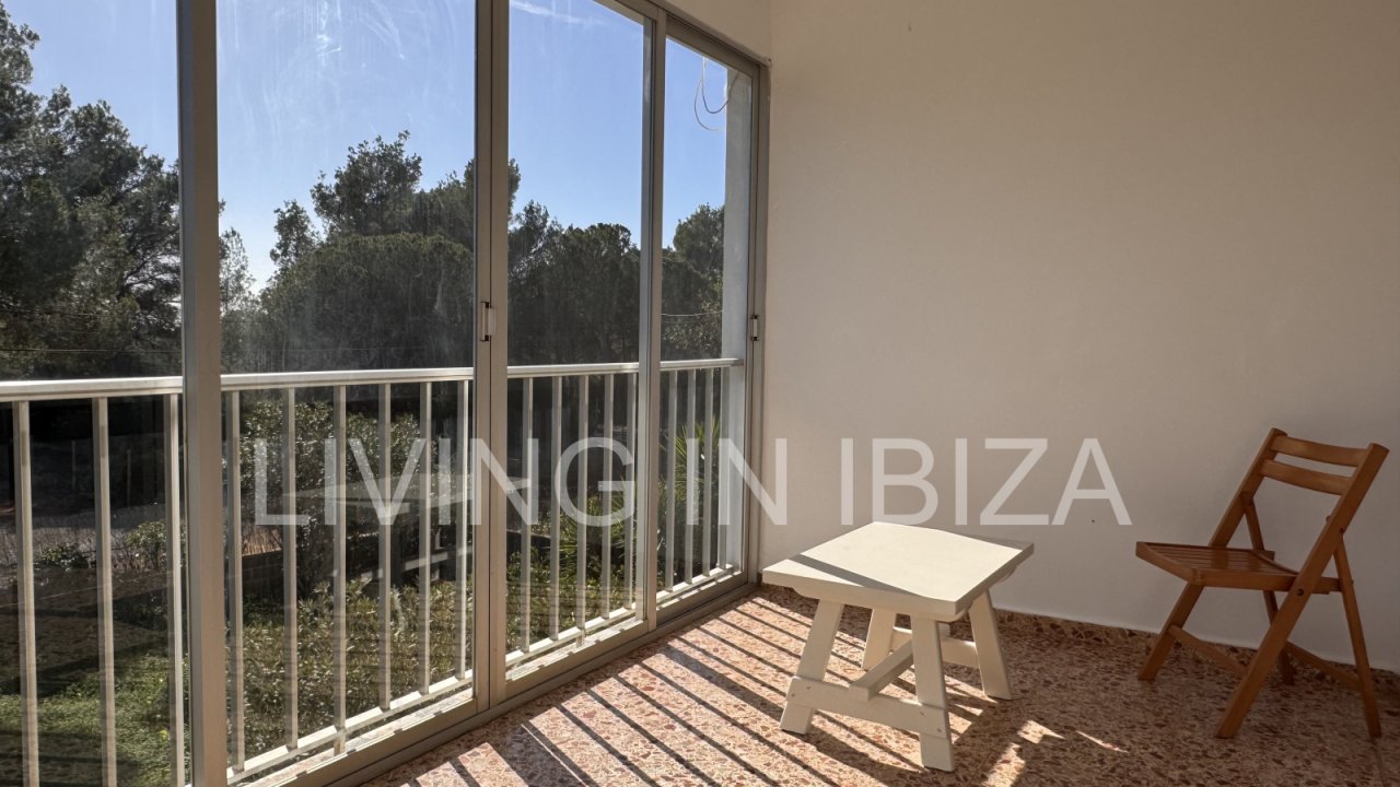 ALQUILER ANUAL. Se alquila anualmente. Casa de un primer piso ubicada en el campo, con acceso por escalera exterior, en la zona de Cala Pada, en Santa Eulalia del Río (Ibiza). Tiene tres dormitorios, dos baños y jardín propio. Disponible a partir de mayo de 2025.
